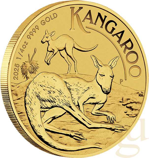 Das „Gold-Kangaroo 2025“ präsentier wie jedes Jahr ein Kangaroo Motiv auf der Vorderseite. Das Motiv wird ergänzt durch die Umschrift „AUSTRALIEN KANGAROO“, die Jahreszahl „2025“, das Münzgewicht und dem Feinheitsgrad in Höhe von 9999. Zusätzlich trägt es rechts das traditionelle Münzzeichen „P“ für die Perth Mint. Auf der Wertseite befindet sich Dan Thornes Bildnis King Charles III. gemeinsam mit Thornes Initialen „DT“. Die umlaufende Schrift besteht aus der Beschriftung „CHARLES III.“ ,dem Land „AUSTRALIAN“ , sowie dem gesetzlichen Nennwert.