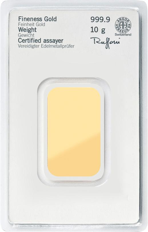Dieser 10g schwere Feingoldbarren besteht aus reinstem 999.9er Gold und wird von der Heraeus Metals Germany GmbH & Co. KG hergestellt. Die Firma Heraeus mit Sitz in Hanau bei Frankfurt am Main ist weltweit tätig und befindet sich seit mehr als 160 Jahren in Familienbesitz. Heraeus gehört gemeinsam mit seiner in der Schweiz ansässigen Firmenbeteiligung Argor-Heraeus zu den größten Herstellern von Goldbarren und anderen Edelmetallbarren in Europa und der Welt. Die Firma Heraeus entstand Mitte des neunzehnten Jahrhunderts ursprünglich aus einer Apothekerfamilie, welche ein Verfahren zur Platinschmelze durch Knallgas entwickelte. Die Argor S. A. wurde 1951 im Schweizer Kanton Tessin gegründet. 1973 gehörte das Unternehmen zu 100 % der UBS. Im Jahr 1986 wurde dann ein Joint-Venture mit Heraeus geschlossen.