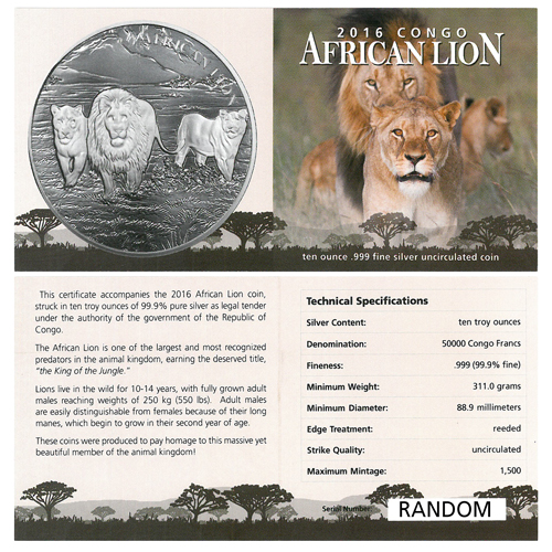 Produktinformationen "10 Unzen Silbermünze Afrika Kongo Löwe 2016"