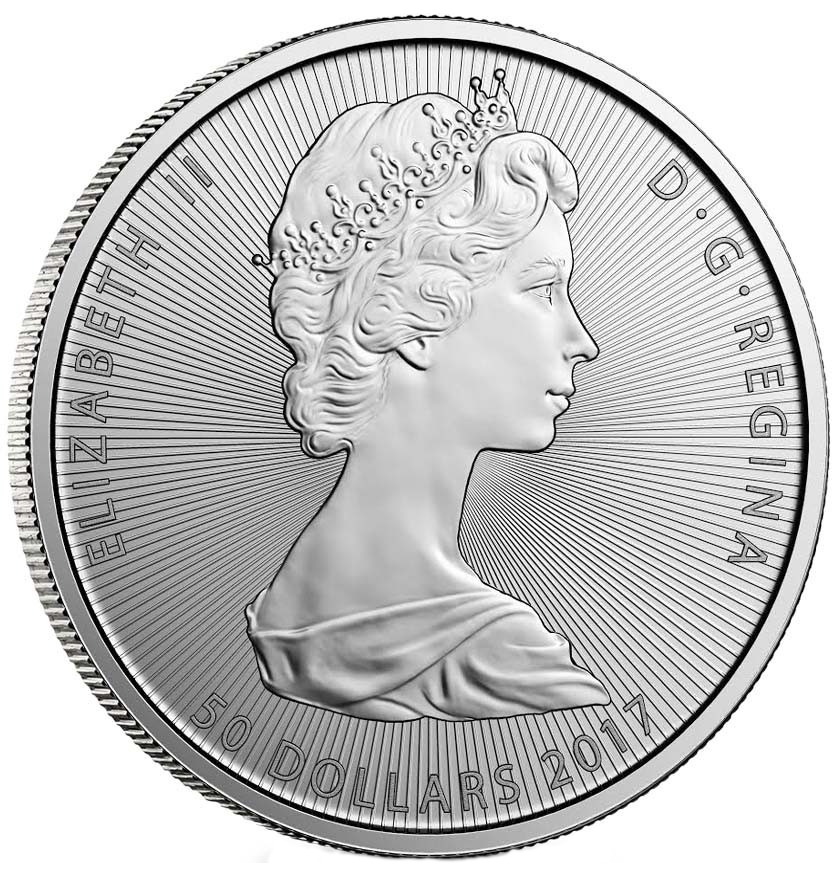 Die Royal Canadian Mint prägt seit 1979 die beliebte Maple Leaf Goldmünze. Im Jahre 1988 wurde der kanadische Silber Maple Leaf zum ersten Mal geprägt. Im März 2017 wird erstmals eine 10oz Silbermünze Maple Leaf herausgegeben. Aufgrund hervorragender Prägequalität gehören diese zu den beliebtesten und auflagenstärksten Silberanlagemünzen der Welt. Die aus dem englischen stammende Münzbezeichnung "Maple Leaf" bedeutet schlicht „Ahornblatt“. Als Bildvorlage wurde das Blattwerk des Zucker-Ahorns ausgewählt - dieses gilt als Wahrzeichen Kanadas und wird auch auf der kanadischen Flagge dargestellt. Das Ahornblatt des 10 oz Maple Leaf in Silber wurde von Celia Godkin gestaltet. Ihre Initialen befinden sich unterhalb des rechten Ahornblattes. Der Silber 10 oz Magnificent Maple unterscheidet sich vom klassischen Silber Maple Leaf, auf der Vorderseite werden zwei Blätter des Silberahornbaumes abgebildet. In der Umschrift wird das herausgebende Land „CANADA“ sowie das Ausgabejahr „2017“genannt. Im unteren Randbereich ist das Feingewicht „10 OZ“ ausgewiesen, eingerahmt von der englischen „FINE SILVER“ und der französischen „ARGENT PUR“ Bezeichnung für Feinsilber, sowie der Feinheitsangabe „9999“. Erstmals erfolgt die Ausgabe einer 10 Unzen Silbermünze mit visuellem Sicherheits-Merkmal, ein lasergraviertes Mini-Ahornblatt. Mit dieser Einzigartigkeit garantiert die Royal Canadian Mint dem Silberanleger zusätzliche Sicherheit. Das Laserzeichen ändert sich jährlich und zeigt die jeweils letzten beiden Zahlen des Prägejahres. Ein zweites Sicherheits-Merkmal sind die aufgeprägten radialen Linien. Die Wertseite der Silbermünze „Magnificent 10oz Maple Leaf 2017“ zeigt ein Portrait von Königin Elizabeth II. das von Susanna Blunt gestaltet wurde. Es stellt die Queen, die zugleich das offizielle Staatsoberhaupt Kanadas ist, mit Schulteransatz von der Seite dar. Als Schmuck trägt sie einen Ohrring und eine Perlenkette. Auf der rechten Schulter sind die Initialen von Susanna Blunt „SB“ eingeprägt. Die Royal Canadian Mint verwendet das 2003 entworfene Portrait seit dem Jahrgang 2004. Der Münzhintergrund der Wertseite ist vollständig von Radiallinien bedeckt. Im Randbereich ist unten der Nennwert „50 DOLLARS“ ausgewiesen und links die dargestellte „ELIZABETH II“ genannt. Am rechten Rand ist die Inschrift „D.G. REGINA“ für „Dei Gratia Regina“ (deutsch: „von Gottes, Gnaden, Königin“), zu lesen.