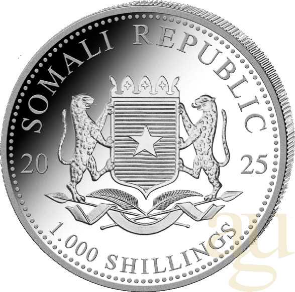 Die Münze Somalia Elefant Silber erscheint seit 2004 mit jährlich wechselnden Motiven afrikanischer Elefanten. Die Agenturausgaben wurden zunächst vom Bayerischen Hauptmünzamt und seit 2014 von Geiger Edelmetalle AG in der Schweiz unter Lizenz des Ausgabelandes Somalia geprägt. Aktuell beträgt der Nennwert der Münze 100 SOS (Somalia Shilling). Bis 2006 war diese Münze 1000 SOS wert. (Nennwert) Auf der Wertseite ist das Wappen Somalias abgebildet.