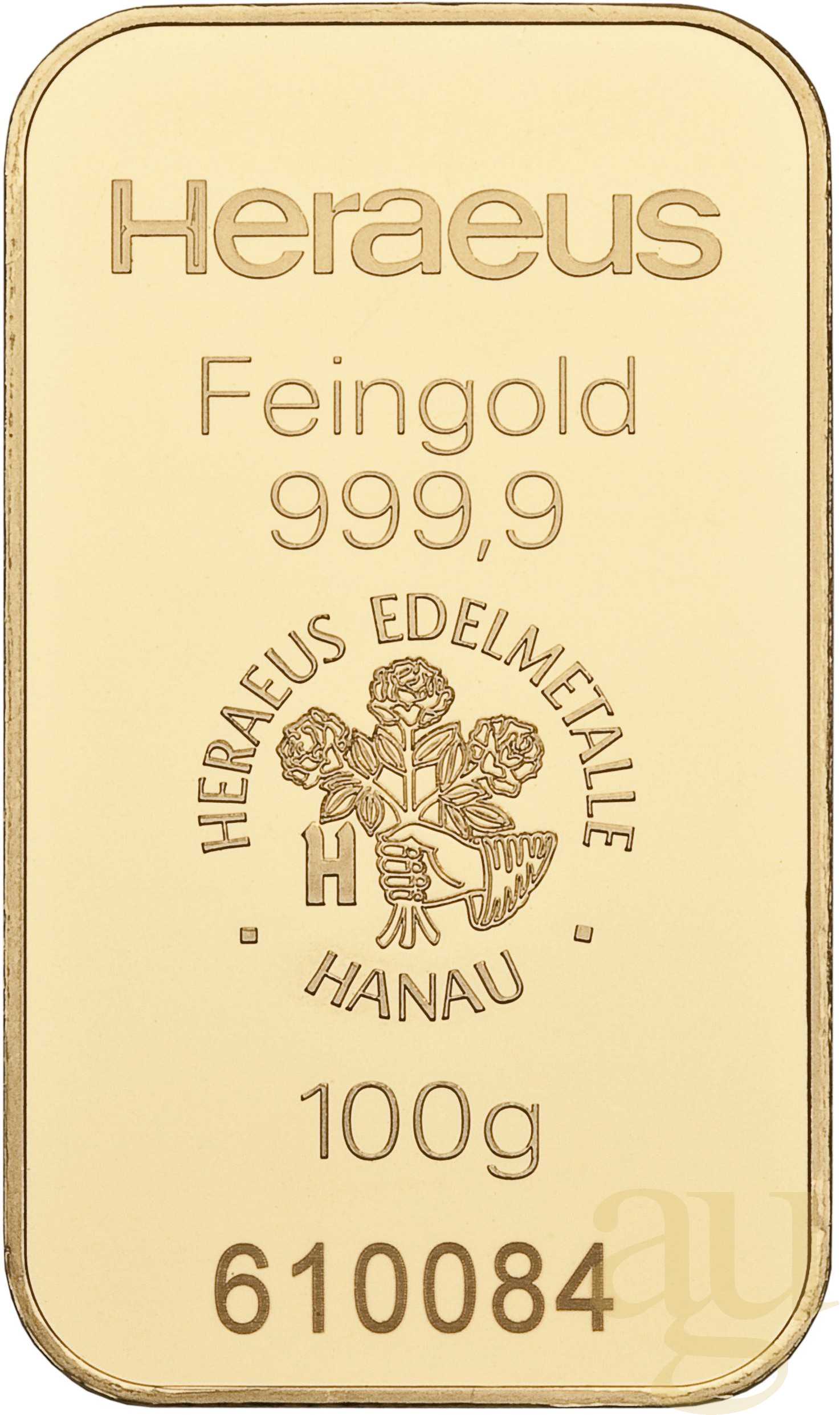 Dieser 100 Gramm schwere Feingoldbarren besteht aus reinstem 999.9er Gold und wird von der Heraeus Metals Germany GmbH & Co. KG hergestellt. Die Firma Heraeus mit Sitz in Hanau bei Frankfurt am Main ist weltweit tätig und befindet sich seit mehr als 160 Jahren in Familienbesitz. Heraeus gehört gemeinsam mit seiner in der Schweiz ansässigen Firmenbeteiligung Argor-Heraeus zu den größten Herstellern von Goldbarren und anderen Edelmetallbarren in Europa und der Welt. Die Firma Heraeus entstand Mitte des neunzehnten Jahrhunderts ursprünglich aus einer Apothekerfamilie, welche ein Verfahren zur Platinschmelze durch Knallgas entwickelte. Die Argor S. A. wurde 1951 im Schweizer Kanton Tessin gegründet. 1973 gehörte das Unternehmen zu 100 % der UBS. Im Jahr 1986 wurde dann ein Joint-Venture mit Heraeus geschlossen. Goldbarren mit einer Masse von 100g werden aus einem Goldblech ausgestanzt und anschließend geprägt. Heraeus bietet zudem 100g Goldbarren in gegossener Form an. Der Barren ist mit dem charakteristischen Heraeus Wappen, welches als Motiv eine Hand voller Rosen trägt, geprägt. Hinzu kommt die Prägung von Gewicht, der Feinheit des Goldes so wie eine einmalige Seriennummer. Die Goldbarren von Heraeus sind LBMA zertifiziert, das bedeutet dass sie auf der sogenannten LBMA Good Delivery List geführt werden. Alle Edelmetallbarren entsprechen dadurch dem international anerkannten "London Good Delivery Standard", der die aufgeprägten oder eingestanzten Merkmale wie Feinheit und Gewicht sowie die ständige, ununterbrochene Aufbewahrung in akzeptierten Lagerungsanstalten garantiert, so dass die Barren weltweit ohne Einschränkungen bankhandelsfähig sind. Die Barren sind in einer Blisterkarte mit Zertifikat und Seriennummer verpackt. Die Verpackung sieht nicht nur ansprechend aus und ist mit zwei Schweißnähten besonders stabil, sie besteht zudem aus dem umweltfreundlichen Kunststoff PET. Die Maße sind vergleichbar mit einer Scheckkarte - 85mm x 55mm.