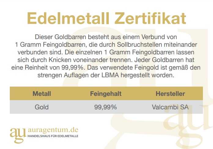 Dieser Tafelbarren besteht aus einem Verbund von 10 x 1g Feingoldbarren die voneinander getrennt werden können. Der Feingoldgehalt berägt 999.9/1.000 und das Feingewicht 10g.