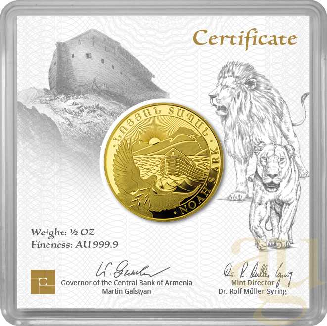 Im September 2020 erschien die Goldmünze Arche Noah aus Armenien erstmals als Anlagemünze in Stempelglanz. Die Geiger Edelmetalle AG besitzt das Prägerecht und produziert die Münze in Deutschland. Auf der Vorderseite ist das aus der Bibel bekannte Schiff in aufgewühlter See vor im Hintergrund verlaufenden Sonnenstrahlen über dem armenischen Gebirge Ararat zu sehen.