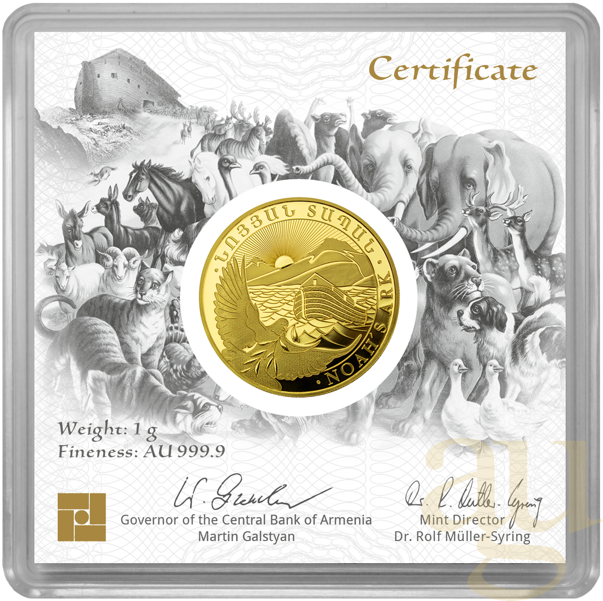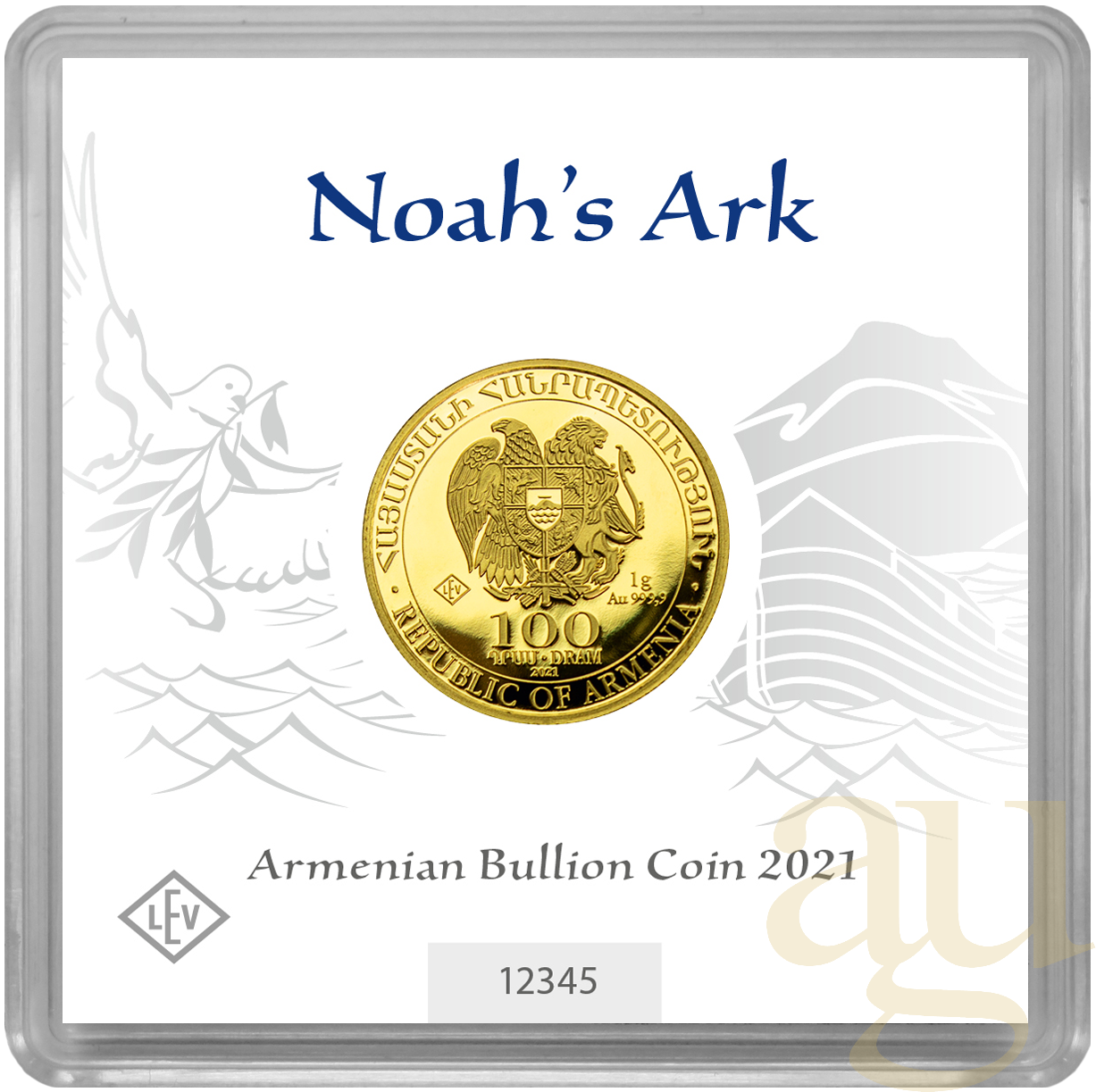 Im September 2020 erschien die Goldmünze Arche Noah aus Armenien erstmals als Anlagemünze in Stempelglanz. Die Geiger Edelmetalle AG besitzt das Prägerecht und produziert die Münze in Deutschland. Auf der Vorderseite ist das aus der Bibel bekannte Schiff in aufgewühlter See vor im Hintergrund verlaufenden Sonnenstrahlen über dem armenischen Gebirge Ararat zu sehen.