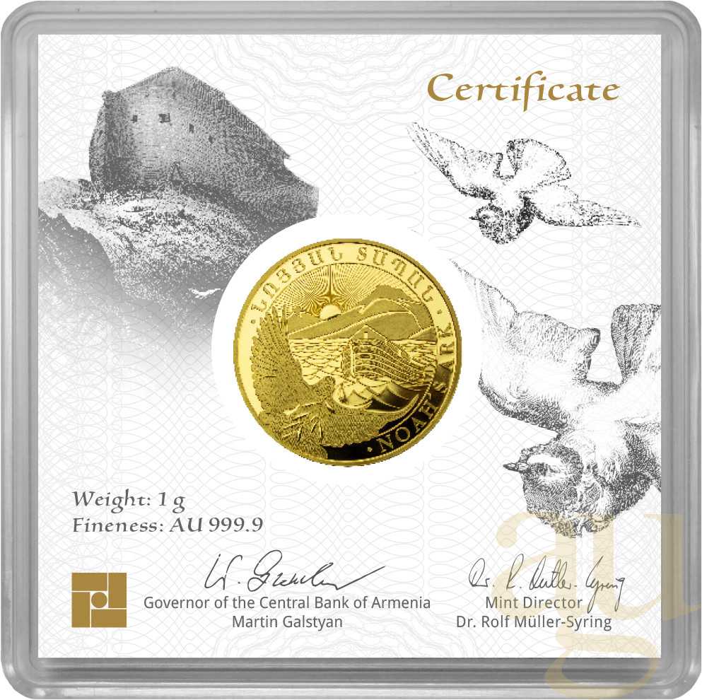Im September 2020 erschien die Goldmünze Arche Noah aus Armenien erstmals als Anlagemünze in Stempelglanz. Die Geiger Edelmetalle AG besitzt das Prägerecht und produziert die Münze in Deutschland. Auf der Vorderseite ist das aus der Bibel bekannte Schiff in aufgewühlter See vor im Hintergrund verlaufenden Sonnenstrahlen über dem armenischen Gebirge Ararat zu sehen.