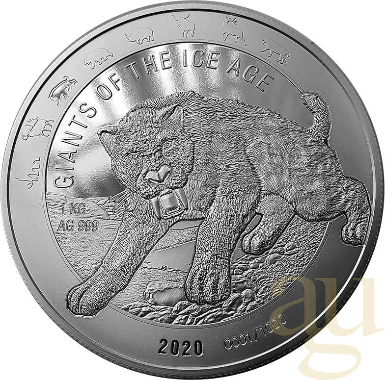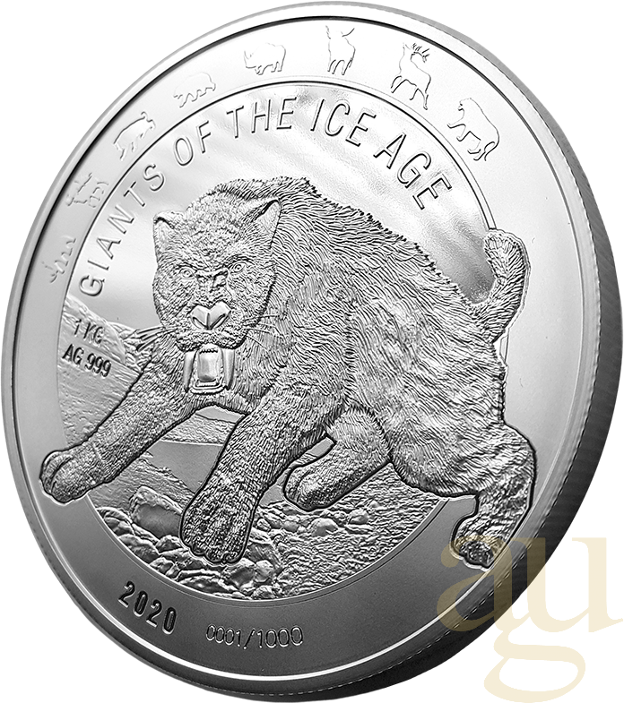 Die Giganten der Eiszeit  - 1 Kilogramm Silbermünze Giganten der Eiszeit - Höhlenbär 2020 Die 1kg Silbermünze in Stempelglanz ist auf nur 1.000 Stück limitiert und wird ebenfalls mit einem nummerierten Zertifikat ausgegeben. Auch hier wird die jeweilige Seriennummer direkt auf der Münzvorderseite sehen zu sein.  Weitere Informationen zur Serie finden Sie direkt hier: https://ice-age-giants.com/ Die Säbelzahnkatzen ist eine ausgestorbene Linie der Katzen und wird als die Unterfamilie der Machairodontinae bezeichnet. Sie zählen damit zu den Raubtieren und lebten bereits vor über 20 Millionen Jahren. Sie traten erstmals im späten Eozän Nordamerikas und Eurasiens auf. Säbelzahnkatzen erhielten ihren Namen wegen der extrem langen, gebogenen Eckzähne, die bei der größten Art bis zu 28 cm lang werden konnten. Ihre Opfer waren vor allem die großen Pflanzenfresser der offenen Steppen und jagten und lebten im Rudel.