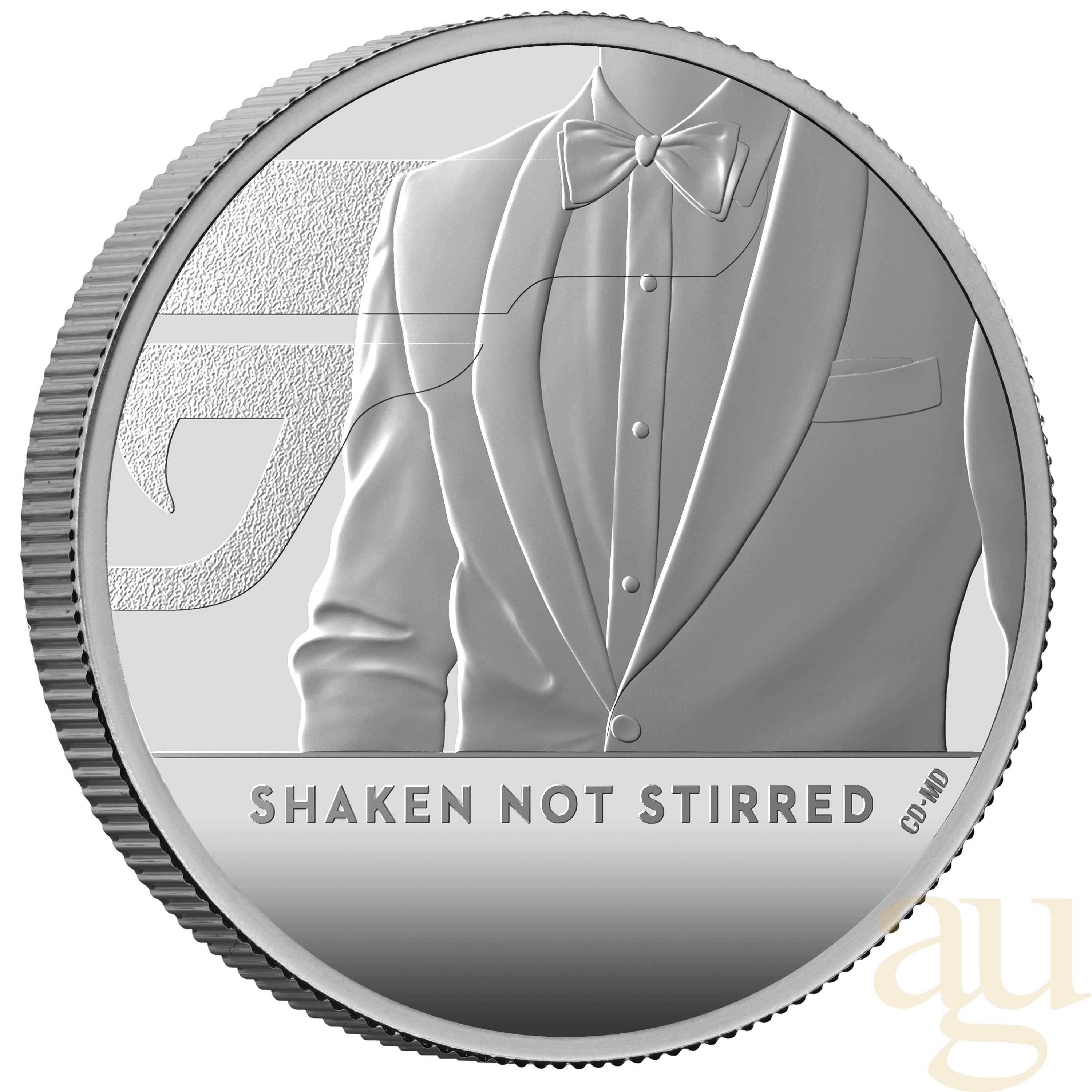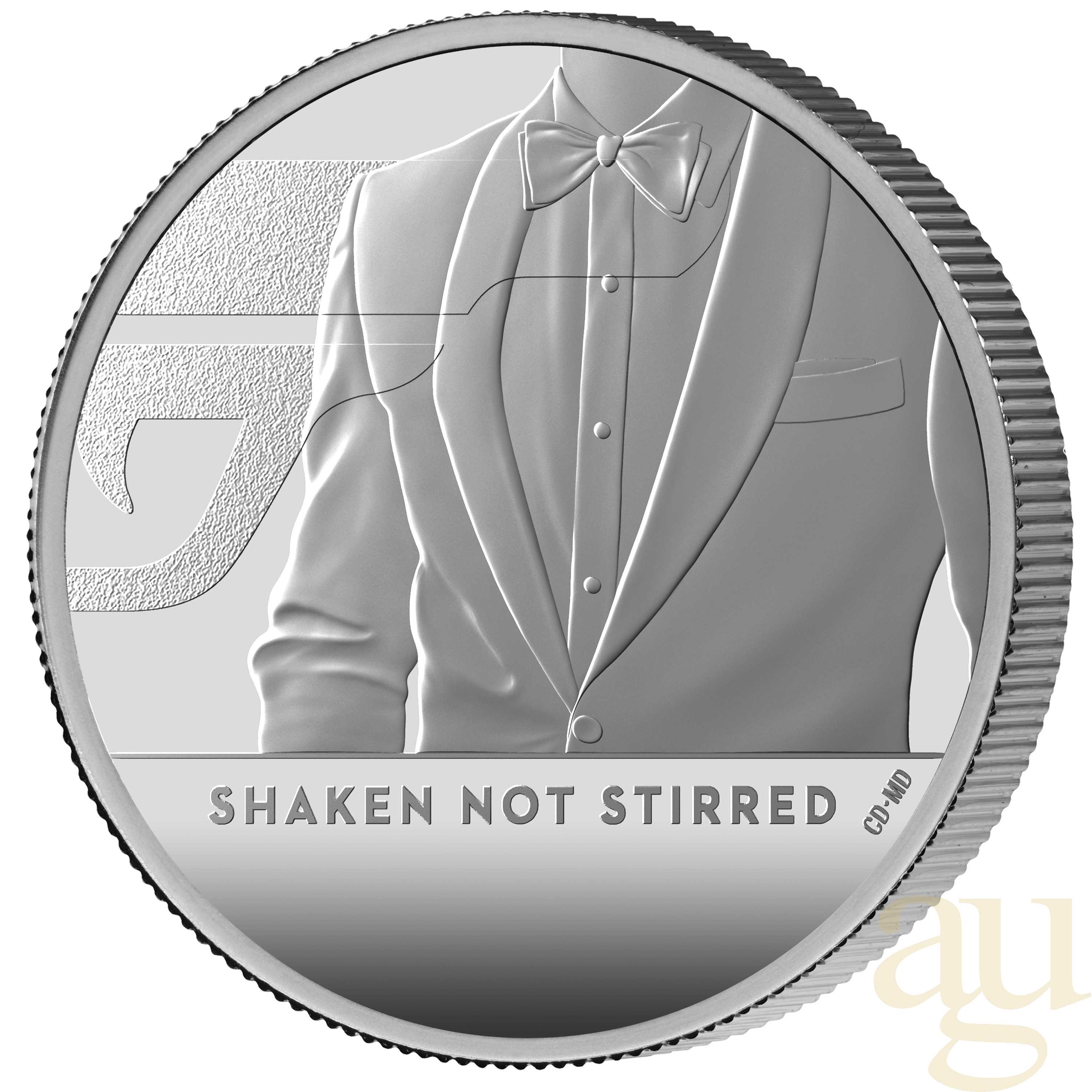 Die Motivseite zeigt einen Oberkörper stilvoll gekleidet in Smoking mit dem Schriftzug "Shaken not Stirred". Dieser Satz bezieht sich auf Martini, dem Lieblingsgetränk des Agenten, welches James Bond stehts geschüttelt und nicht gerührt zu sich nimmt. Die Rückseite der Münze zeigt das Portrait Ihrer Majestät Königin Elizabeth II. sowie den Nennwert, die Feinheit und das Ausgabejahr.