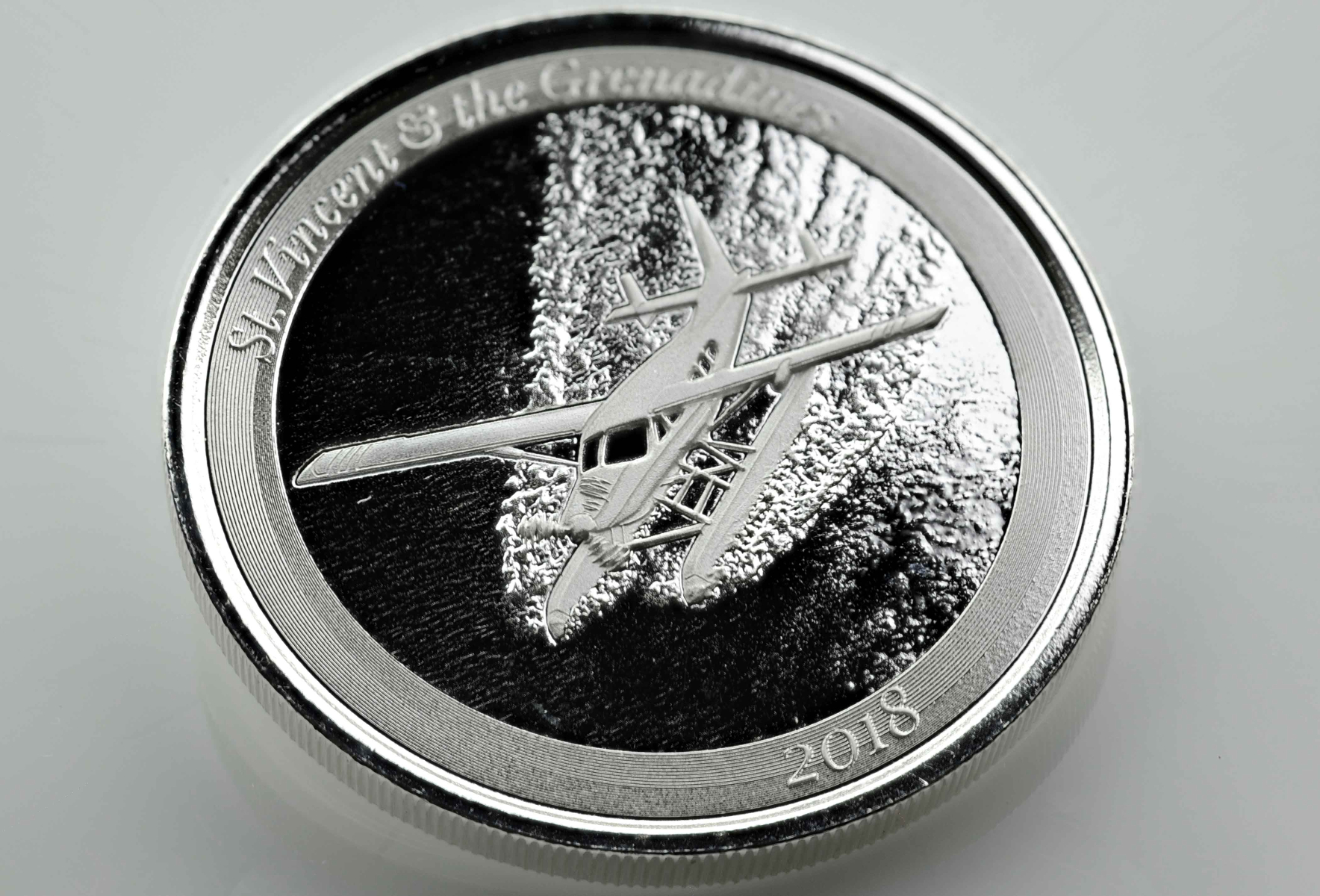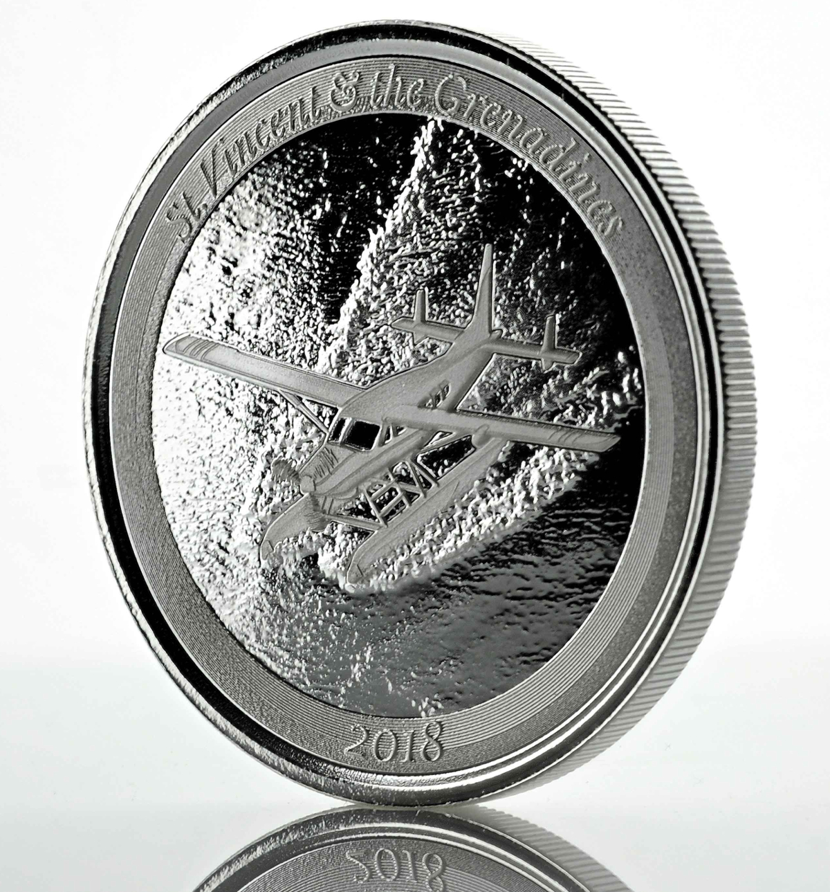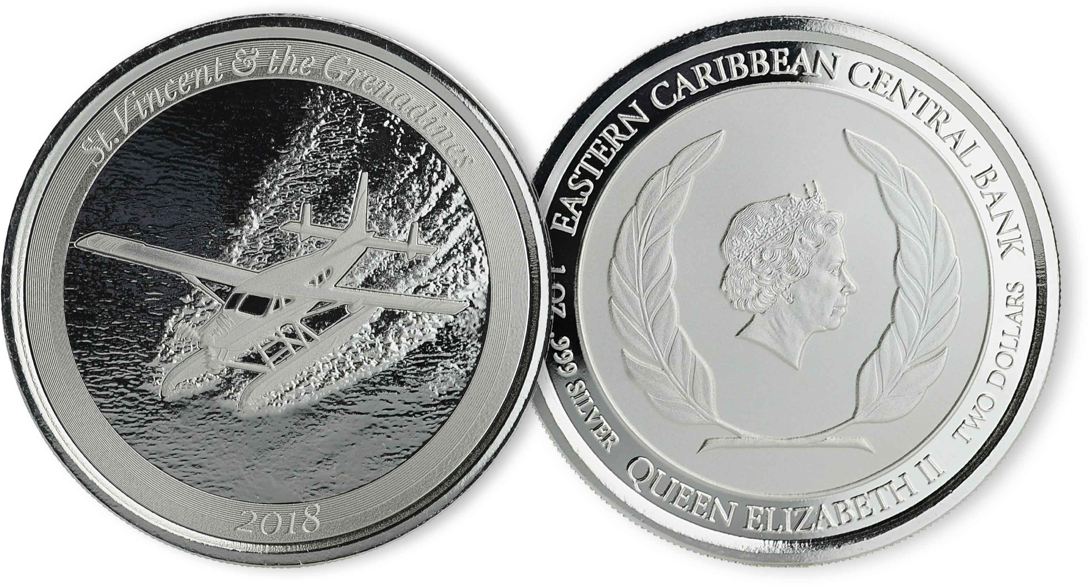 Diese wunderschöne 1 Unze Silbermünze EC8 St. Vincent & The Grenadines - Seaplane 2018 (Blister, Zertifikat) aus dem Jahr 2019 besitzt einen Edelmetallanteil von 99,9% FeinSilber, sowie ein Feingewicht von 31,10g und wird mit einer Stückelung von 1 Unze in einer Blister mit Zertifikat ausgeliefert. Die Silbermünzen besitzen einen Nominalwert von 2 XCD (Ostkaribische Dollar).