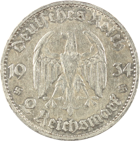 2 Reichsmark Silbermünze Hindenburg mit HK Umlaufmünzen aus Silber wurden von 1933 bis 1939 im Dritten Reich mit den Nennwerten 2 Reichsmark und 5 Reichsmark geprägt. Bei den Motiven wird unterschieden zwischen Garnisonkirche und Hindenburg (damaliger Reichspräsident). Diese beiden Ausführungen wurden in hoher Auflage hergestellt. Seltener und für Numismatiker (Sammler) interessanter sind die Reichsmark Prägungen Luther vom Jahre 1933 und Schiller vom Jahre 1934. Die Prägebuchstaben geben die jeweilige Prägestätte an (A = Berlin, D = München, E= Muldenhütten, F = Stuttgart, G = Karlsruhe, J = Hamburg).