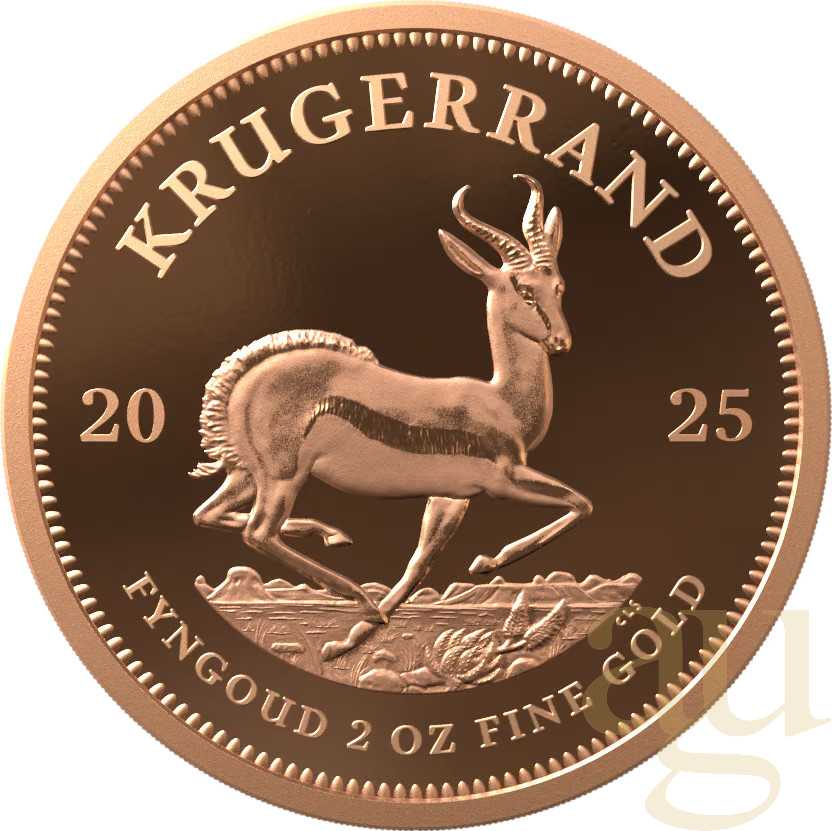 Die Krügerrand Goldmünze ist die bekannteste und zugleich beliebteste Kapitalanlagemünze weltweit. Seit der ersten Prägung 1967 wurden über 46 Million Stück hergestellt und verkauft. Aufgrund des Kupferanteils von ca. 9% erhält die Münze einen rötlich-goldenen Farbton. Die Feinheit beträgt 916,6/1.000. Das Kupfer wird zusätzlich zum reinen Goldwert von 2 Unzen (62,2 g) beigemischt, um die Münze härter zu machen und sie so vor Beschädigungen wie Kratzer, Dellen und Abschürfungen zu schützen.