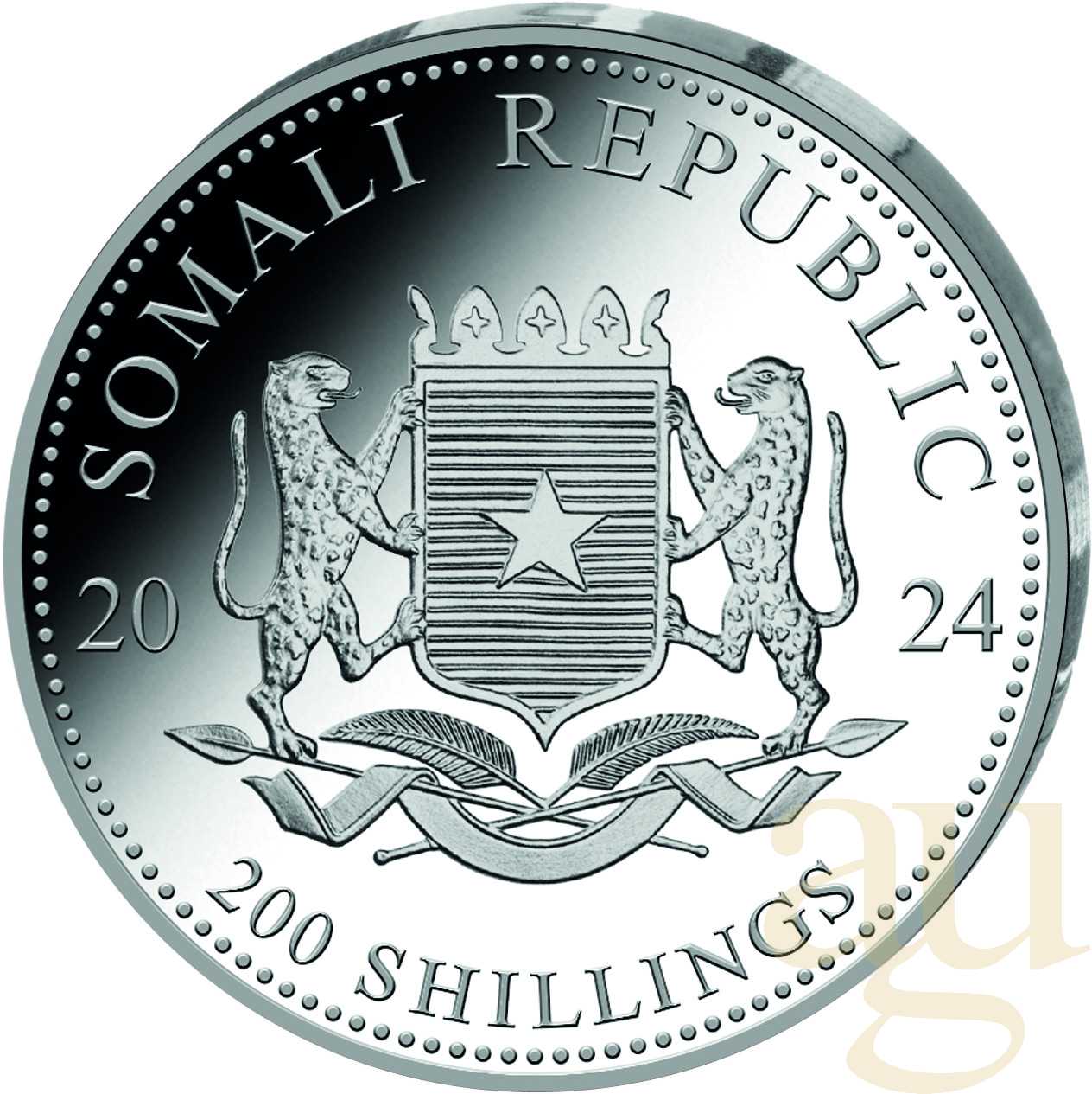 Die Münze Somalia Elefant Silber erscheint seit 2004 mit jährlich wechselnden Motiven afrikanischer Elefanten. Die Agenturausgaben wurden zunächst vom Bayerischen Hauptmünzamt und seit 2014 von Geiger Edelmetalle AG in der Schweiz unter Lizenz des Ausgabelandes Somalia geprägt. Aktuell beträgt der Nennwert der Münze 100 SOS (Somalia Shilling). Bis 2006 war diese Münze 1000 SOS wert. (Nennwert) Auf der Wertseite ist das Wappen Somalias abgebildet.