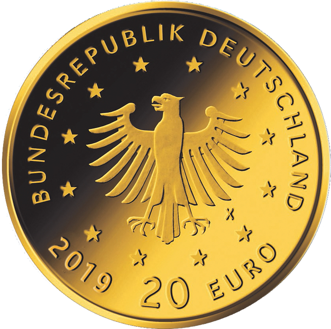 20 Euro Goldmünze Heimische Vögel - Wanderfalke 2019 (A) Der Siegerentwurf für das Münzmotiv der 20-Euro-Gold-Gedenkmünze "Wanderfalke" entstammt der Feder des Berliner Künstlers Bodo Broschat, der auch schon die Bildseite der "Nachtigall" gestaltet hatte. Der Entwurf zeigt einen Wanderfalken in stoischer Sitzhaltung auf einem Felsvorsprung. Doch die Ruhe ist trügerisch, denn den vorbeifliegenden Vogel im Bildhintergrund hat er längst als seine Beute ausgemacht. Das Bild ist charakteristisch für das Jagdverhalten des Wanderfalken. Schließlich starten sie, um ihre Beute abzupassen, entweder von einer erhöhten Sitzwarte oder stürzen aus hohem Kreisflug auf sie hinab. Links im unteren Rundbogen ist noch der Münzname angebracht, oberhalb davon das Symbol der jeweiligen Prägestätte. Die durchgängig gleichbleibende, von Adelheid Fuss gestaltete Wertseite, zeigt mittig den frei gestalteten Bundesadler mit nach links gewendetem Blick, eingefasst von den 12 Europasternen. In der äußeren Rundschrift sind das Ausgabeland "Bundesrepublik Deutschland", das aktuelle Ausgabejahr "2019" sowie die zugehörige Wertziffer ("20 EURO" Nominal) ausgewiesen. Der Rand der Goldmünze besitzt wie immer eine geriffelte Struktur.