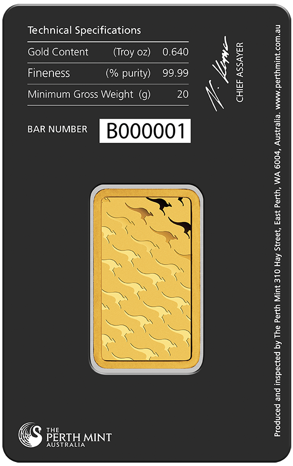 Die Perth Mint ist die älteste Münzprägeanstalt in Australien. Im Jahr 1896 wurde Sie von Sir John Forrest in der Stadt Perth gegründet. Die Betriebsaufnahme erfolgte im Jahr 1899 als eine Niederlassung der Royal Mint aus London. Goldmünzen, Silbermünzen, Platinmünzen sowie Palladiummünzen von der Perth Mint sind sehr beliebt, da diese in einer sehr hohen Prägequalität und überwiegend in einer schönen Plastikkapsel ausgeliefert werden. Alle Goldbarren zur Kapitalanlage mit Motiv "Känguru" auf der Rückseite werden in einer hochwertigen Blisterverpackung ausgegeben. Seit Ende 2015 wurde die Farbe der Blisterkarten von Grün auf Schwarz umgestellt. Angaben zum Feingoldgehalt, Gewicht und Seriennummer sind auf der ansprechenden Rückseite der Verpackung zu finden. Anders wie bei Heraeus Goldbarren wird die Seriennummer nicht direkt auf den Barren geprägt. Laut Herstellerangabe handelt es sich bei den Abmessungen um maximale Werte.