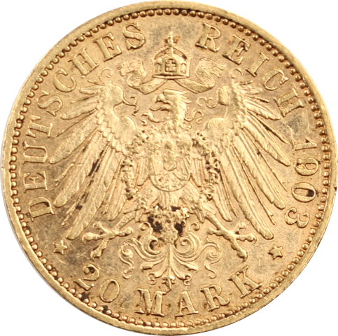 Die deutsche Reichsgründung erfolgte am 18. Januar 1871 mit der Proklamation des preußischen Königs Wilhelm I. zum Deutschen Kaiser in Versailles. Im Zuge der Reichsgründung wurde eine Währungsreform durchgeführt. Hierbei wurde der Taler durch die Mark als Zahlungsmittel ersetzt. Jeder Regent der 25 Teilstaaten hatte das Recht eine eigene Goldmark zu prägen. Die Porträtseite zeigt den jeweiligen Regenten. Auf der anderen Seite sind das Staatswappen, Nennwert und Prägejahr zu sehen.