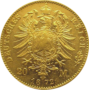 Die deutsche Reichsgründung erfolgte am 18. Januar 1871 mit der Proklamation des preußischen Königs Wilhelm I. zum Deutschen Kaiser in Versailles. Im Zuge der Reichsgründung wurde eine Währungsreform durchgeführt. Hierbei wurde der Taler durch die Mark als Zahlungsmittel ersetzt. Jeder Regent der 25 Teilstaaten hatte das Recht eine eigene Goldmark zu prägen. Die Porträtseite zeigt den jeweiligen Regenten. Auf der anderen Seite sind das Staatswappen, Nennwert und Prägejahr zu sehen.
