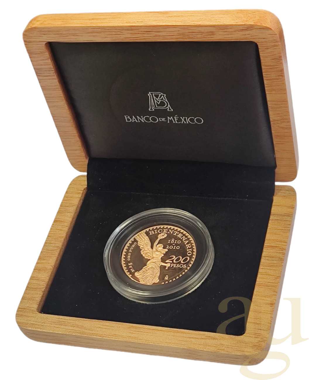 Die 200 Pesos Goldmünze Mexiko Bicentenario 2010 Goldmünze ist eine Münze geprägt für die 200 Jahre Unabhängigkeit von Mexiko. Sie wurde 2010 geprägt. Die Vorderseite der Goldmünze zeigt die Siegesgöttin mit ausgebreiteten Flügeln. Die andere Seite der Münze zeigt einen Adler, der vom Wappen Mexicos abgeleitet ist.