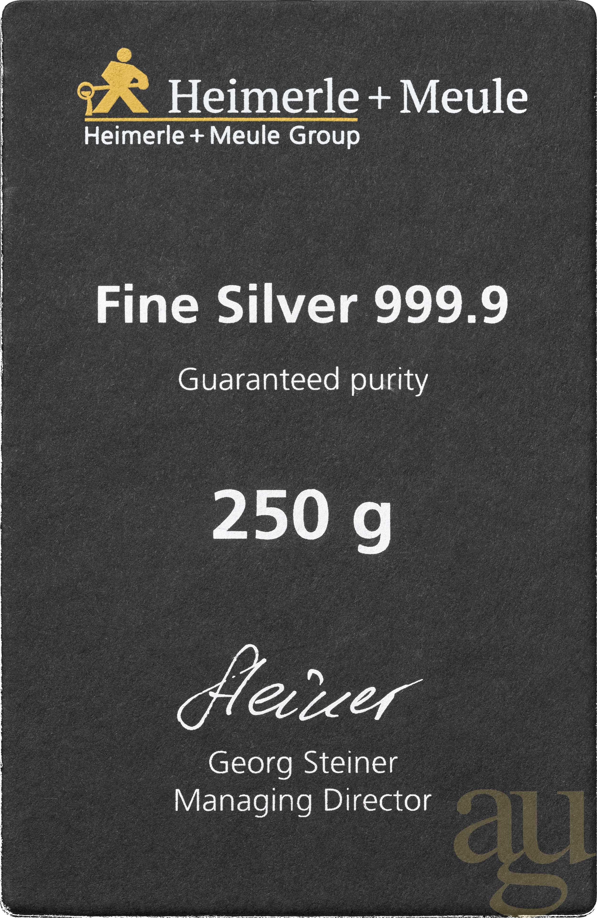 Die Firma Heraeus mit Sitz in Hanau bei Frankfurt am Main ist weltweit tätig und befindet sich seit mehr als 160 Jahren in Familienbesitz. Heraeus gehört gemeinsam mit seiner in der Schweiz ansässigen Firmenbeteiligung Argor-Heraeus zu den größten Herstellern von Edelmetallbarren in Europa und der Welt. Die Silberbarren aus dem Hause Heraeus sind von 5 Gramm bis zu 15 Kilogramm erhältlich..Dieser 250 Gramm Silberbarren in gegossner Form wird im Gussverfahren hergestellt, wobei die Eigenschaften eines typischen Gussteiles die typisch konische Form bzw. Rundungen und dergleichen aufweisen. Unter dem Namen des Barrenherstellers finden sich auf der Vorderseite aller Barren die Angaben "Feinsilber" und "999,9", die die Metallart und dessen Feinheit aufweist. Die Barren sind mit dem charakteristischen Heraeus Wappen, welches als Motiv eine Hand voller Rosen trägt und umgeben von der Rundschrift "Heraeus Edelmetalle Hanau" darstellt. Die Angaben zum Feingewicht der Barren ergänzen die Angaben. Die Reinheit aller Silberbarren wurde in 2014 auf 999,9 erhöht und die gegossenen Barren mit einer Seriennummer versehen. Alle Barren von 5g - 5kg sind in Folie verpackt. Die 15kg Barren sind nicht verpackt und werden lose ausgegeben. Weder für geprägte noch gegossene Barren gibt es ein Zertifikat. Die Barren von Heraeus sind LBMA zertifiziert, das bedeutet dass sie auf der sogenannten LBMA Good Delivery List geführt werden. Alle Edelmetallbarren entsprechen dadurch dem international anerkannten "London Good Delivery Standard", der die aufgeprägten oder eingestanzten Merkmale wie Feinheit und Gewicht sowie die ununterbrochene Aufbewahrung in akzeptierten Lagerungsanstalten garantiert, so dass die Barren weltweit ohne Einschränkungen bankhandelsfähig sind.