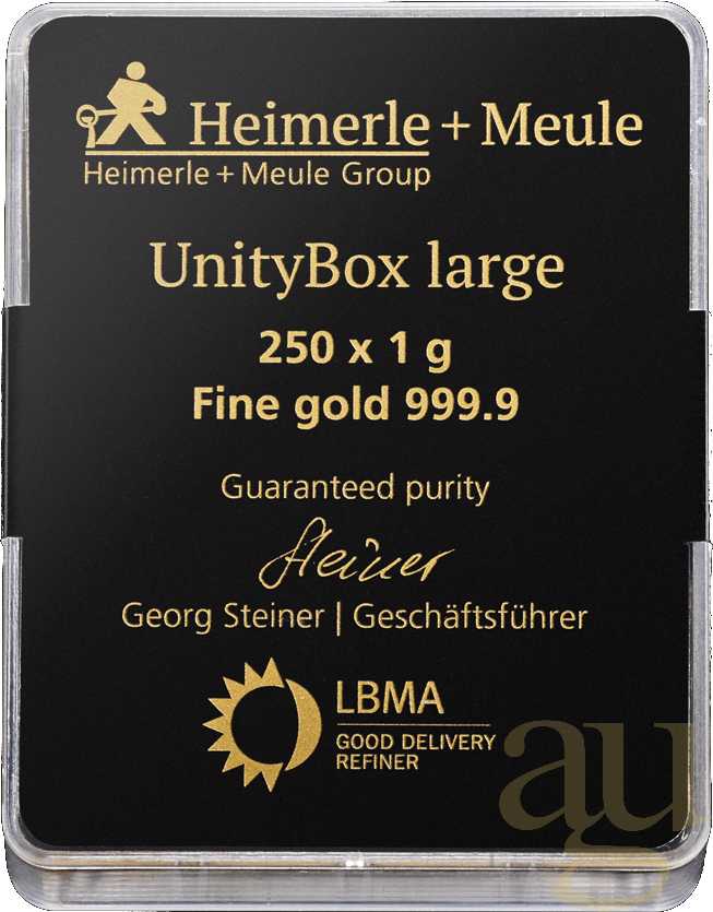 Produktinformationen "250 x 1 Gramm Goldbarren Heimerle + Meule UnityBox"