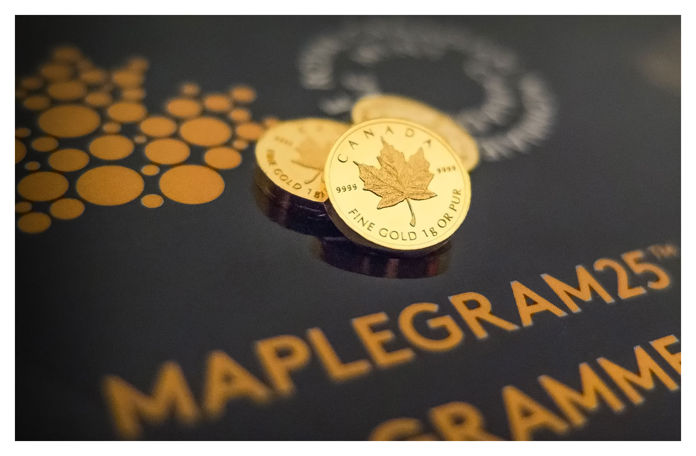 Die Royal Canadian Mint bietet seit dem Prägejahr 2014 die bekannte Maple Leaf Goldmünze in 1g Einheiten an. Ausgeliefert werden diese Minigoldmünzen in einem Verbund von 25 Stück je Verpackungseinheit. Der Sammelblister befindet sich einem praktischen Schutzumschlag aus Karton. Die einzelnen 1 Gramm Goldmünzen lassen sich durch leichtes knicken problemlos voneinander trennen und später einmal einzeln wieder verkaufen. MAPLEGRAM sind ideal auch zur Krisenvorsorge als Tausch- oder Zahlungsmittel geeignet. Der Feingoldgehalt beträgt 999,9 / 1.000. Der Nennwert pro Münze beträgt 0,5 kanadische Dollar.