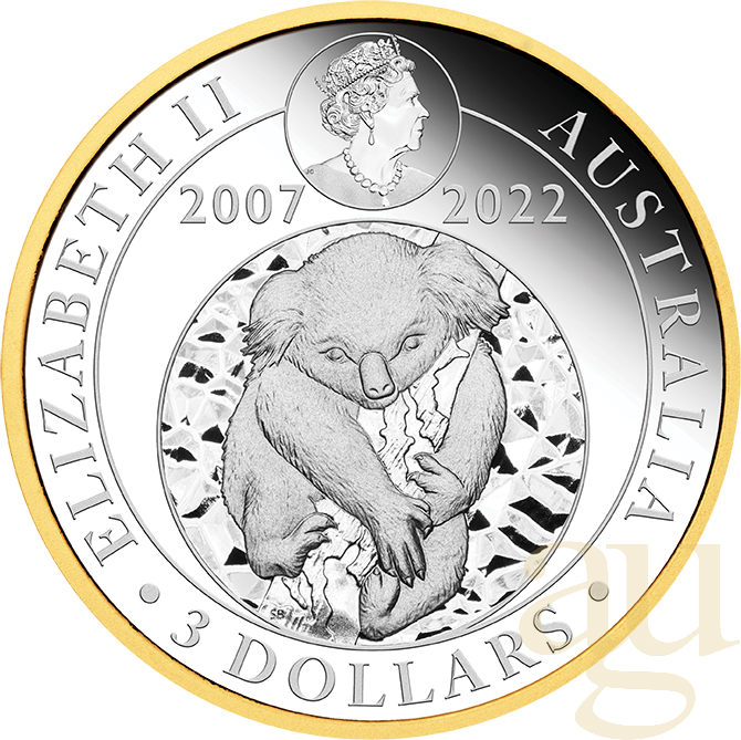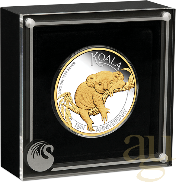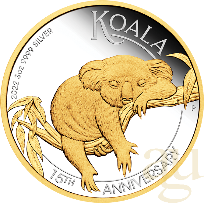Produktinformationen "3 Unzen Silbermünze Australien Koala 2022 - 15 Jahre Jubiläum - polierte Platte teilvergoldet"