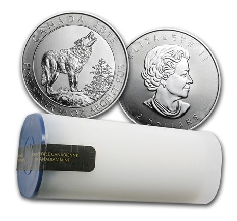 Die Silberanlagemünze mit Motiv "Kanadischer Grauwolf" Prägejahr 2015 wurde im Herbst 2014 von der Royal Canadian Mint vorgestellt. Das ungewöhnliche Gewicht in Höhe von einer 3/4 Unze fällt aus der Reihe der bisher bekannten Anlagemünzen.  Das Motiv des Jahres 2015 wurde vom kanadischen Künstler Pierre Leduc entworfen und zeigt den Grauwolf stehend heulend auf einem Hügel umgeben von Nadelholz. Die Initialen "PL" sind links unterhalb des Schwanzes vom Wolf zu finden. Das Tiermotiv ist von einem Ring umgeben, welcher im oberen Bereich das Ausgabeland "Canada", das Prägejahr 2015 und im unteren Teil das Feingewicht von einer 3/4 Unze aufweist. Aufgrund der Zweisprachigkeit ist die Angabe Silber in Englisch und Französisch zu finden. Unterhalb des Grauwolfs ist die Feinheit von 9999 ergänzt. Die radialen Linien in Reliefform im Hintergrund dienen als Sicherheitsmerkmal. Die Münzrückseite zeigt die englische Königin Elizabeth II. In Rundschrift um das Kopfmotiv sind neben dem Namen der Queen (obenstehend - Elizabeth II) auch der Nennwert von zwei kanadischen Dollar abgebildet. Der Hintergrund ist von radialen Linien überzogen wie die Motivseite.