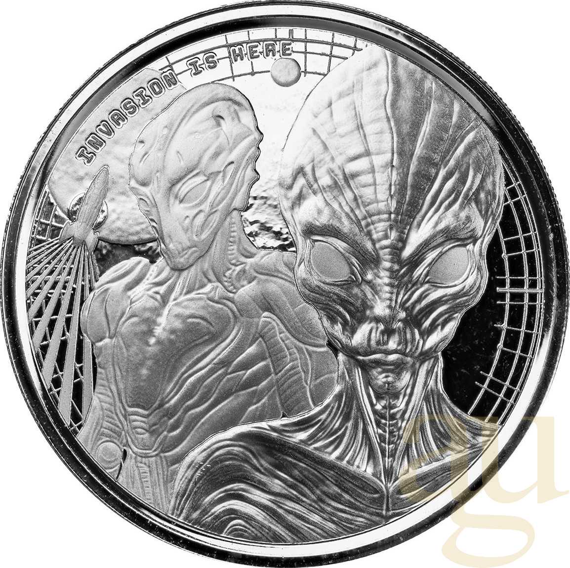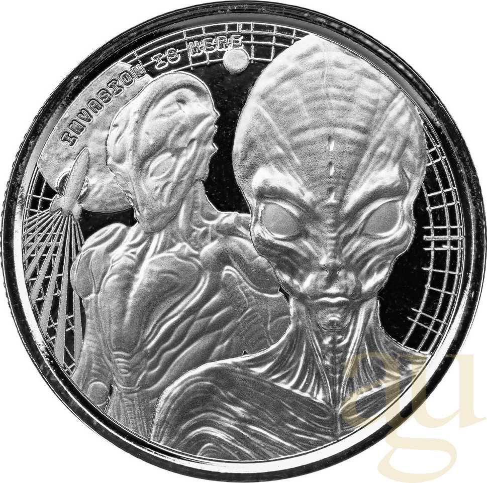 - 1x 1/2 Unze Silbermünze Afrika Ghana Alien 2023 - Rhodium Plated.