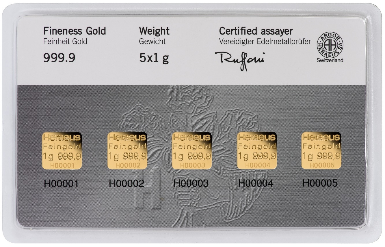 Die Heraeus MultiCards enthalten fünf oder zehn einzelne 1 g-Goldbarren. Diese haben ein neues quadratisches Format, das exklusiv für die MultiCards verwendet wird. Während die Vorderseite der Barren das traditionelle Heraeus Barrenmotiv – Hand mit Rosenstrauß – in den Fokus rückt, ist die Rückseite mit einer fortlaufenden und individuellen Seriennummer versehen. Neben der praktischen Verpackung in einer Blisterkarte bieten die MultiCards zudem eine günstigere Alternative gegenüber dem Erwerb einzelner 1 g-Barren.
