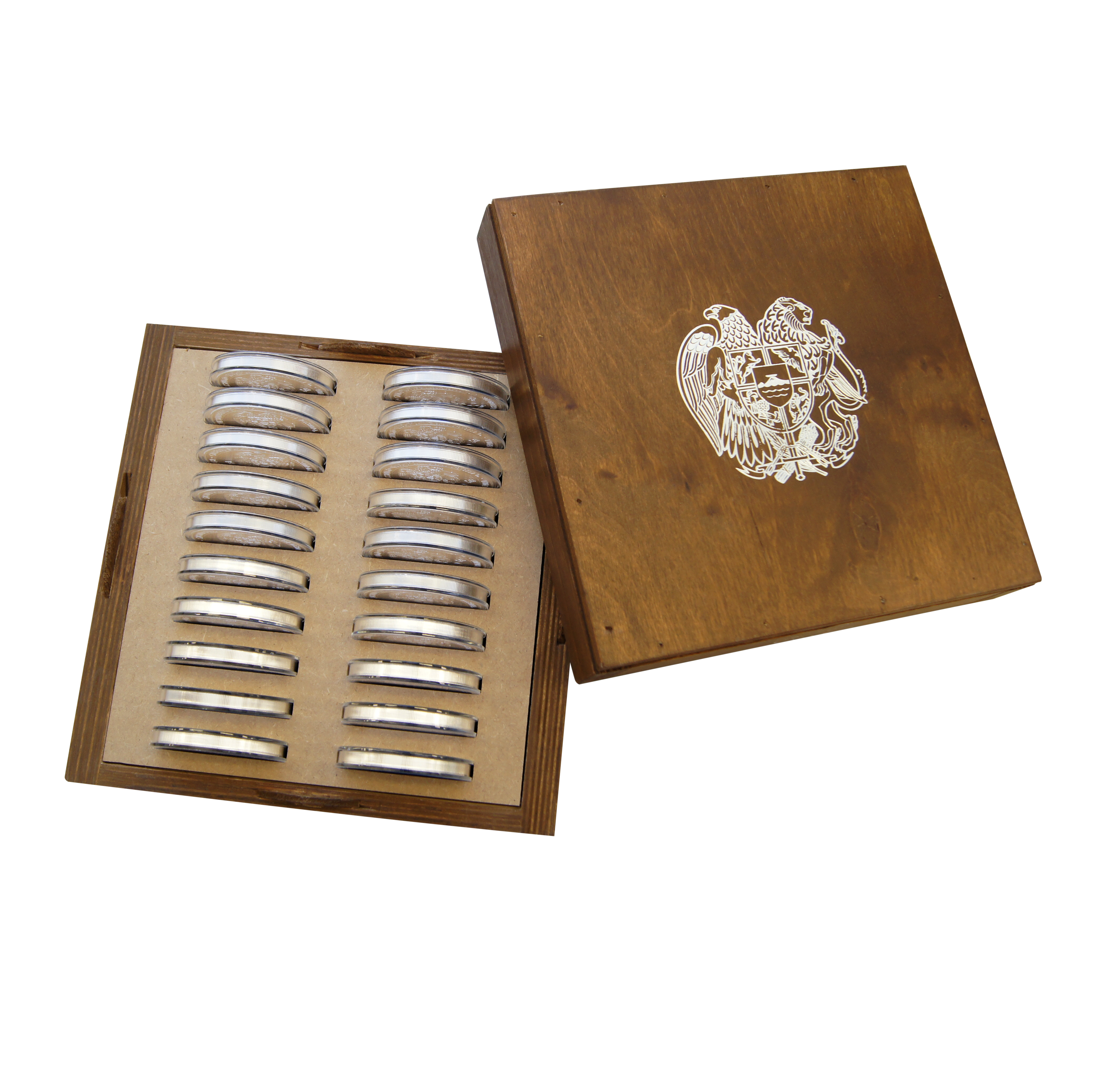 Auragentum bietet Ihnen die Silbermünze Arche Noah einzeln verpackt in Münztaschen an. Bestellungen zu 20 Unzen erhalten Sie in der originalversiegelten Münztube, 500 Unzen liefern wir in der hochwertigen hölzernen Masterbox aus. 1kg Münzen a 10 Stück in der Holzbox.