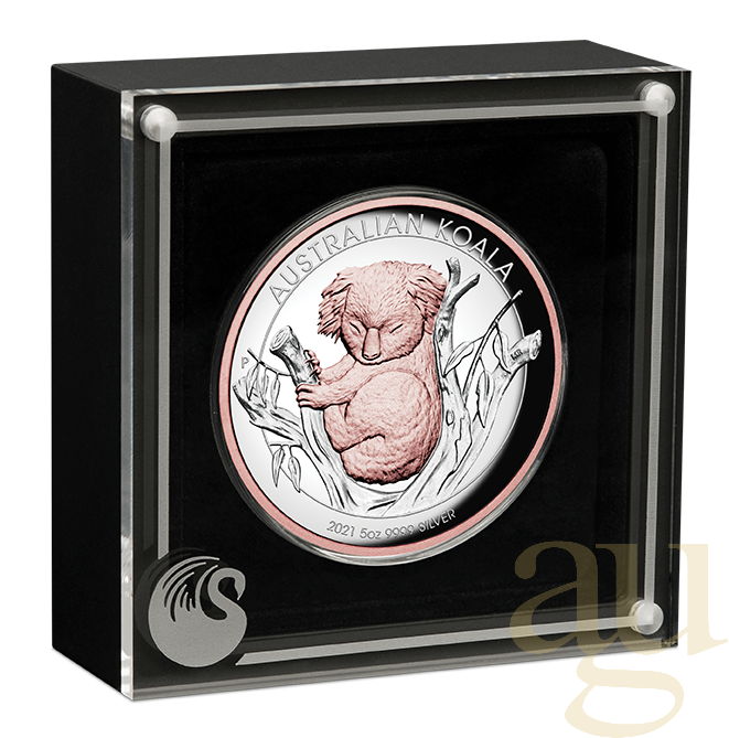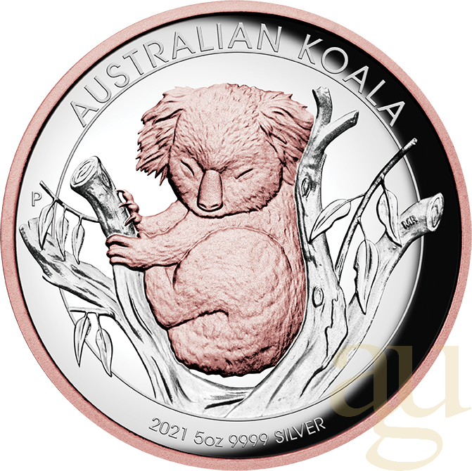 Produktinformationen "5 Unzen Silbermünze Australien Koala 2021 - High Relief - polierte Platte - rosè vergoldet"