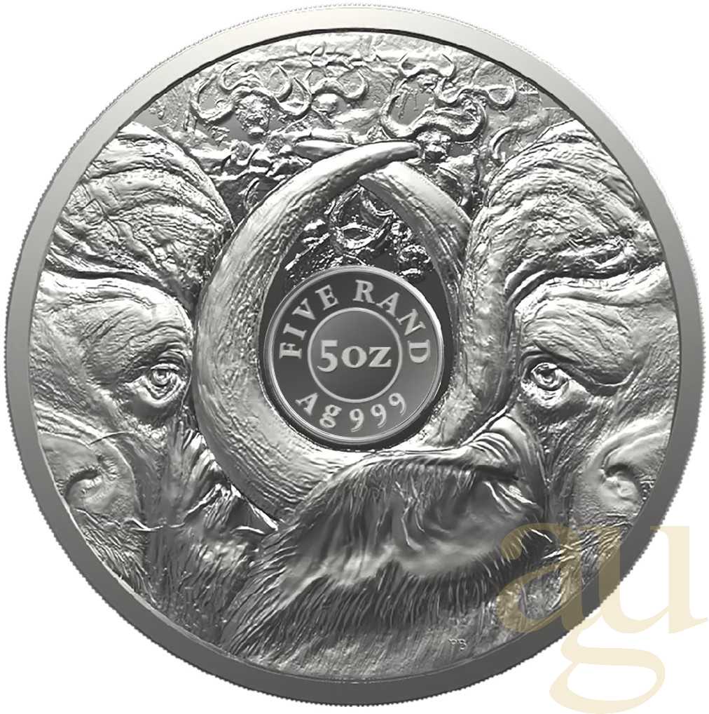 Die Werseite bildet zwei nebeneinanderstehende Nashörner ab. Das linke Nashorn blickt bedrohlich direkt in die Augen des Betrachters, während das rechte Stolz sein charakteristisches Horn präsentiert. Die Angaben "FIVE RAND", "5 Oz" und "999 Ag" geben Auskunft über den Nennwert, die Stückelung und die Reinheit der Münze.