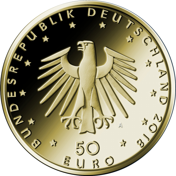 50 Euro Goldmünze Kontrabass 2018 (A) Die Münze bildet den Auftakt einer fünfteiligen Serie „Musikinstrumente“ (2018 – 2022, eine Ausgabe pro Jahr) zur Würdigung des deutschen Musikinstrumentenbaus, der seit dem Mittelalter eine herausragende Stellung in Europa einnimmt. Die Instrumente sind aufgrund ihrer Qualität und Innovation in der ganzen Welt gefragt und damit Botschafter deutscher Musikkultur im In- und Ausland. Der Entwurf der Münze stammt von dem Künstler Erich Ott aus München. Die Bildseite zeigt den Kontrabass als wichtiges Orchesterinstrument, das repräsentativ in das Münzrund gesetzt ist. Die Wertseite zeigt einen Adler, den Schriftzug „BUNDESREPUBLIK DEUTSCHLAND“, Wertziffer und Wertbezeichnung, die Jahreszahl 2018, die zwölf Europasterne sowie - je nach Prägestätte - das Münzzeichen „A“ (Berlin), „D“ (München), „F“ (Stuttgart), „G“ (Karlsruhe) oder „J“ (Hamburg). Der Münzrand wird geriffelt ausgeführt. Die Münze soll aus Feingold (999,9 Tausendteile) bestehen. Sie wird in Stempelglanzqualität geprägt. Ihre Masse wird 7,78g (¼ Unze) betragen, der Durchmesser 22mm.     Von 2018 bis zum Jahr 2022 erscheinen insgesamt fünf limitierte Münzen: 50-Euro-Goldmünze Kontrabass 2018 50-Euro-Goldmünze Hammerflügel 2019 50-Euro-Goldmünze Orchesterhorn 2020 50-Euro-Goldmünze Pauke 2021 50-Euro-Goldmünze Konzertgitarre 2022.