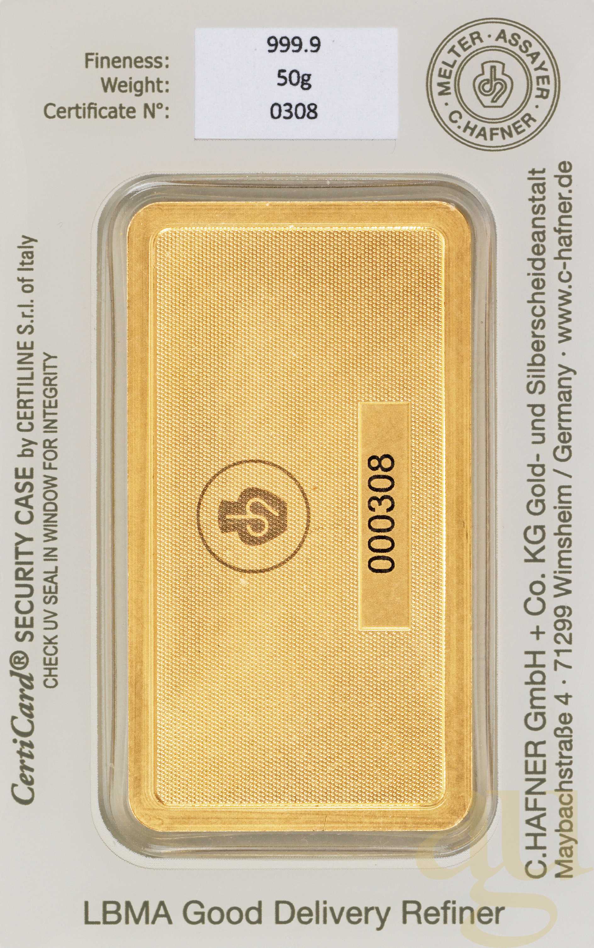 Produktinformationen "50 Gramm Goldbarren C. Hafner"