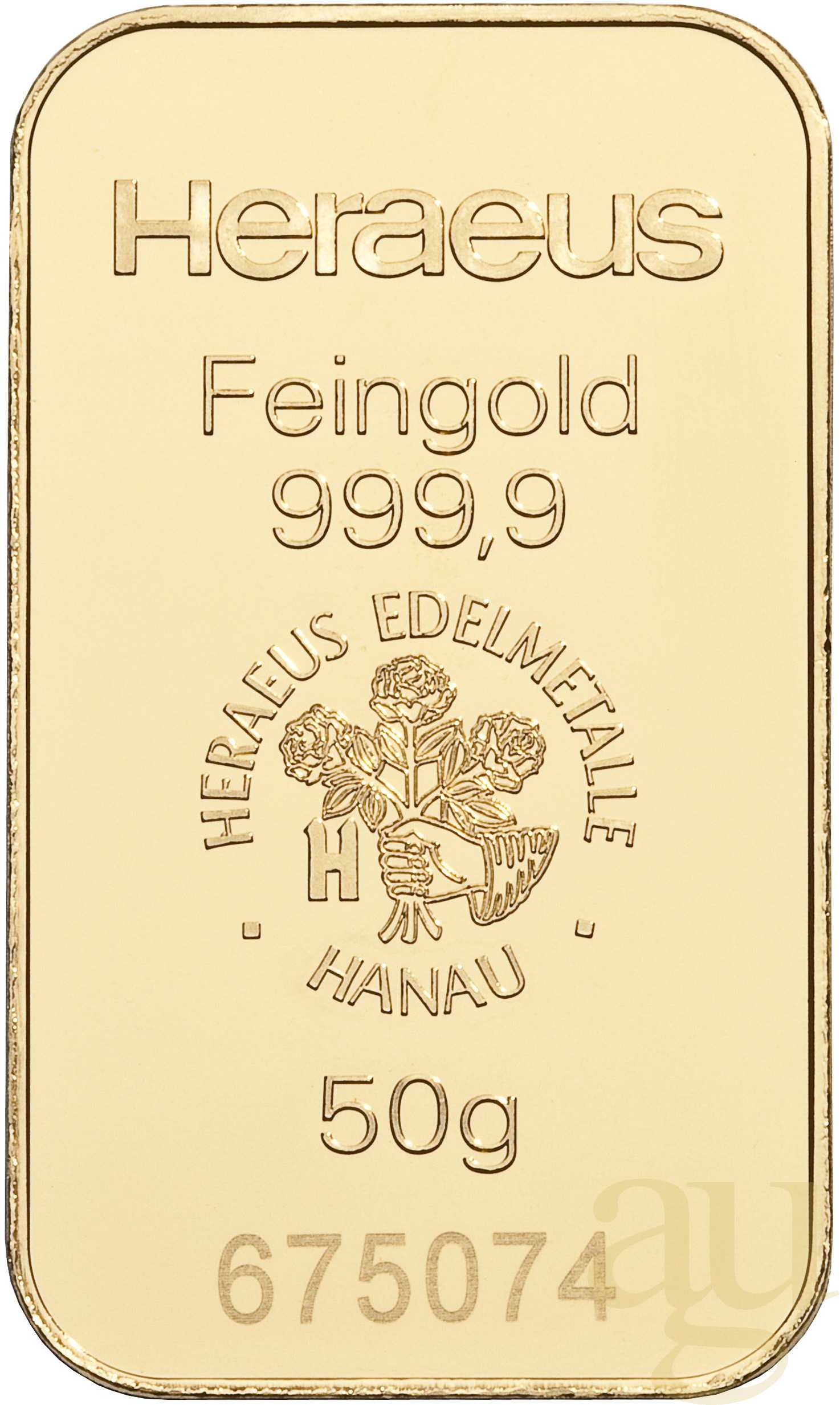 Dieser 50 Gramm schwere Feingoldbarren besteht aus reinstem 999.9er Gold und wird von der Heraeus Metals Germany GmbH & Co. KG hergestellt. Die Firma Heraeus mit Sitz in Hanau bei Frankfurt am Main ist weltweit tätig und befindet sich seit mehr als 160 Jahren in Familienbesitz. Heraeus gehört gemeinsam mit seiner in der Schweiz ansässigen Firmenbeteiligung Argor-Heraeus zu den größten Herstellern von Goldbarren und anderen Edelmetallbarren in Europa und der Welt. Die Firma Heraeus entstand Mitte des neunzehnten Jahrhunderts ursprünglich aus einer Apothekerfamilie, welche ein Verfahren zur Platinschmelze durch Knallgas entwickelte. Die Argor S. A. wurde 1951 im Schweizer Kanton Tessin gegründet. 1973 gehörte das Unternehmen zu 100 % der UBS. Im Jahr 1986 wurde dann ein Joint-Venture mit Heraeus geschlossen. Goldbarren mit einer Masse von 50g werden aus einem Goldblech ausgestanzt und anschließend geprägt.