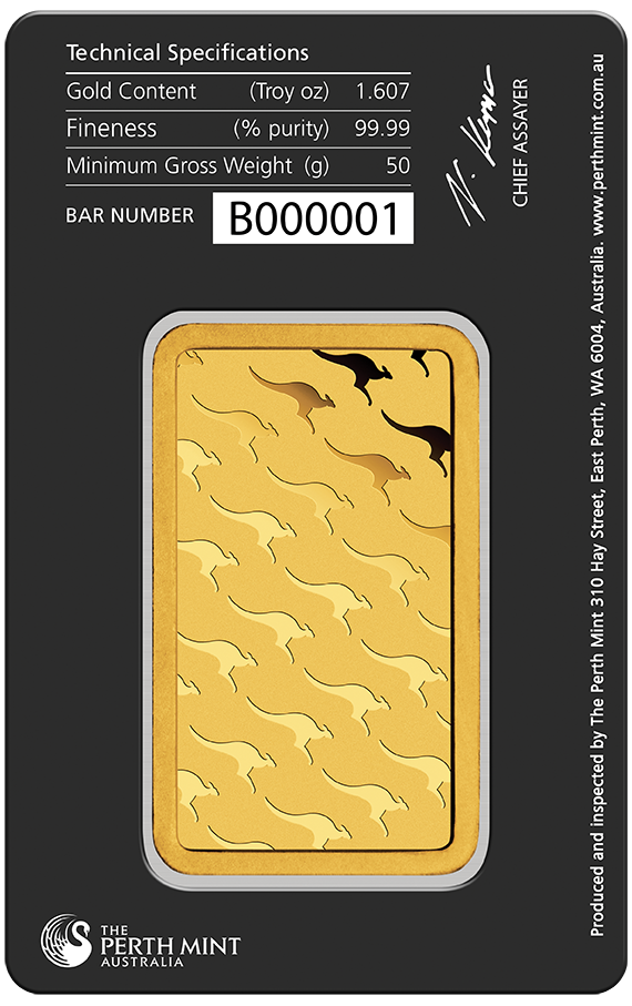 Die Perth Mint ist die älteste Münzprägeanstalt in Australien. Im Jahr 1896 wurde Sie von Sir John Forrest in der Stadt Perth gegründet. Die Betriebsaufnahme erfolgte im Jahr 1899 als eine Niederlassung der Royal Mint aus London. Goldmünzen, Silbermünzen, Platinmünzen sowie Palladiummünzen von der Perth Mint sind sehr beliebt, da diese in einer sehr hohen Prägequalität und überwiegend in einer schönen Plastikkapsel ausgeliefert werden. Alle Goldbarren zur Kapitalanlage mit Motiv "Känguru" auf der Rückseite werden in einer hochwertigen Blisterverpackung ausgegeben. Seit Ende 2015 wurde die Farbe der Blisterkarten von Grün auf Schwarz umgestellt. Angaben zum Feingoldgehalt, Gewicht und Seriennummer sind auf der ansprechenden Rückseite der Verpackung zu finden. Anders wie bei Heraeus Goldbarren wird die Seriennummer nicht direkt auf den Barren geprägt. Laut Herstellerangabe handelt es sich bei den Abmessungen um maximale Werte.