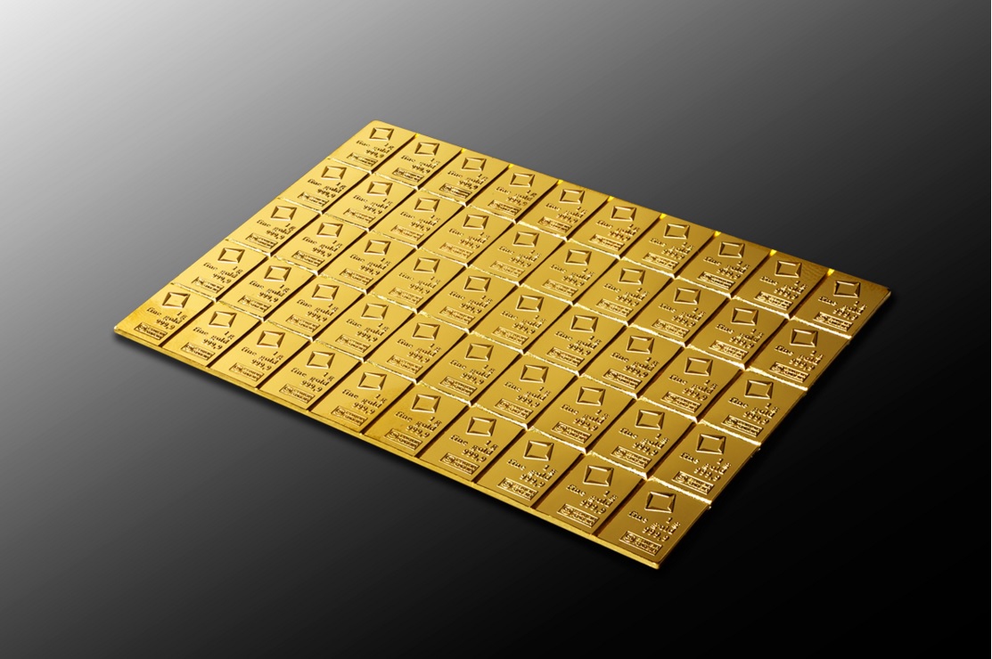 - Good-Delivery LBMA Standard - Dieser Tafelbarren besteht aus einem Verbund von 50 x 1g Feingoldbarren die voneinander getrennt werden können. Der Feingoldgehalt berägt 999.9/1.000 und das Feingewicht 50g.