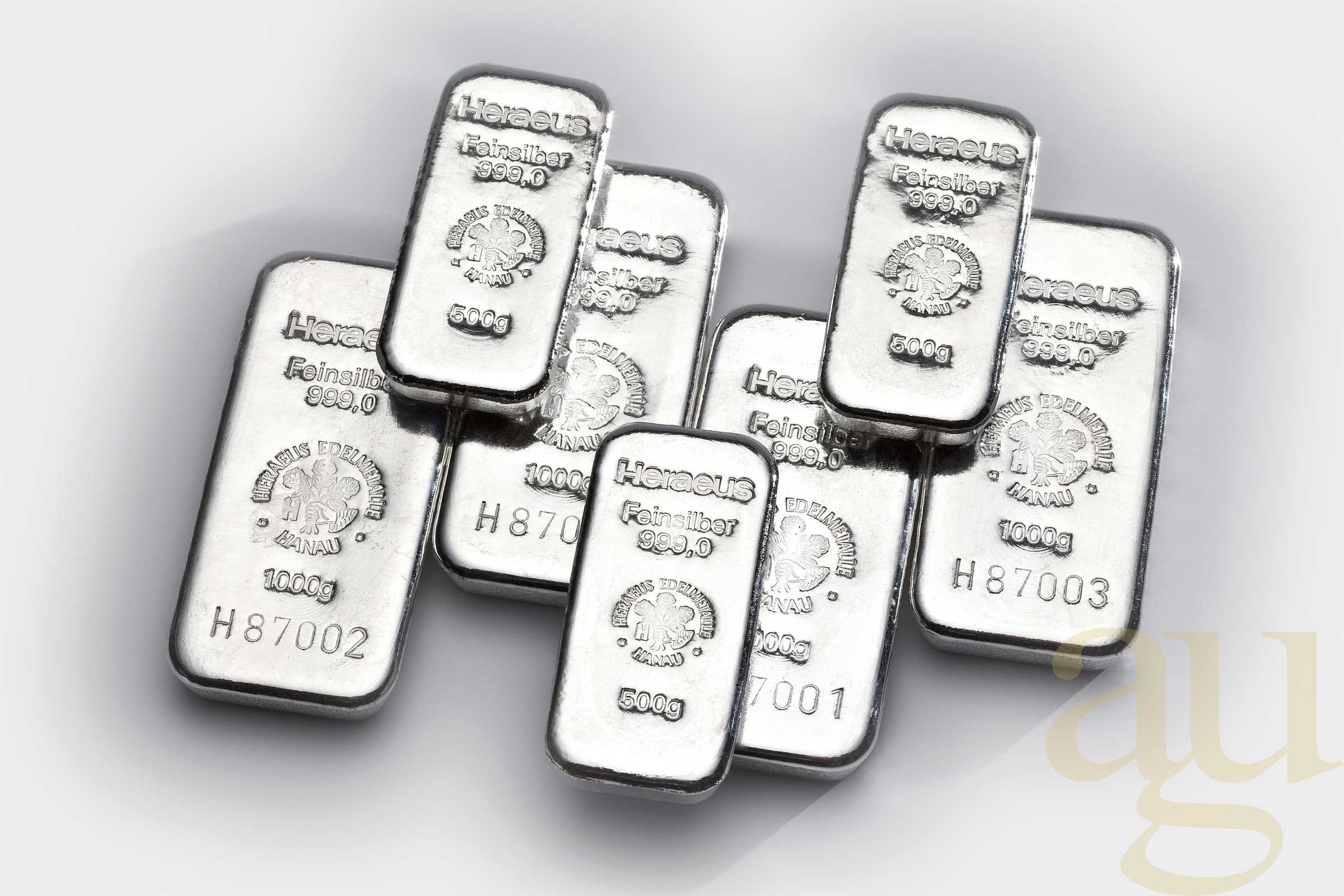 Die Firma Heraeus mit Sitz in Hanau bei Frankfurt am Main ist weltweit tätig und befindet sich seit mehr als 160 Jahren in Familienbesitz. Heraeus gehört gemeinsam mit seiner in der Schweiz ansässigen Firmenbeteiligung Argor-Heraeus zu den größten Herstellern von Edelmetallbarren in Europa und der Welt. Die Silberbarren aus dem Hause Heraeus sind von 5 Gramm bis zu 15 Kilogramm erhältlich. Die 5g bis 250g Silberbarren werden aus einem dicken Silberblech ausgestanzt und weisen teilweise noch die stanztypischen Grate an den Rändern auf. Alle anderen Größen werden im Gussverfahren hergestellt, wobei die Eigenschaften eines typischen Gussteiles die typisch konische Form bzw. Rundungen und dergleichen aufweisen. Unter dem Namen des Barrenherstellers finden sich auf der Vorderseite aller Barren die Angaben "Feinsilber" und "999,9", die die Metallart und dessen Feinheit aufweist. Die Barren sind mit dem charakteristischen Heraeus Wappen, welches als Motiv eine Hand voller Rosen trägt und umgeben von der Rundschrift "Heraeus Edelmetalle Hanau" darstellt. Die Angaben zum Feingewicht der Barren ergänzen die Angaben. Die Reinheit aller Silberbarren wurde in 2014 auf 999,9 erhöht und die gegossenen Barren mit einer Seriennummer versehen. Während die geprägten Barren (1oz - 500g) in einer Blisterkarte verschweißt werden, sind die 1kg und 5kg Barren in Folie geschweißt. Die 15kg Barren sind nicht verpackt. Weder für geprägte noch gegossene Barren gibt es ein Zertifikat. Die Barren von Heraeus sind LBMA zertifiziert, das bedeutet dass sie auf der sogenannten LBMA Good Delivery List geführt werden. Alle Edelmetallbarren entsprechen dadurch dem international anerkannten "London Good Delivery Standard", der die aufgeprägten oder eingestanzten Merkmale wie Feinheit und Gewicht sowie die ununterbrochene Aufbewahrung in akzeptierten Lagerungsanstalten garantiert, so dass die Barren weltweit ohne Einschränkungen bankhandelsfähig sind.