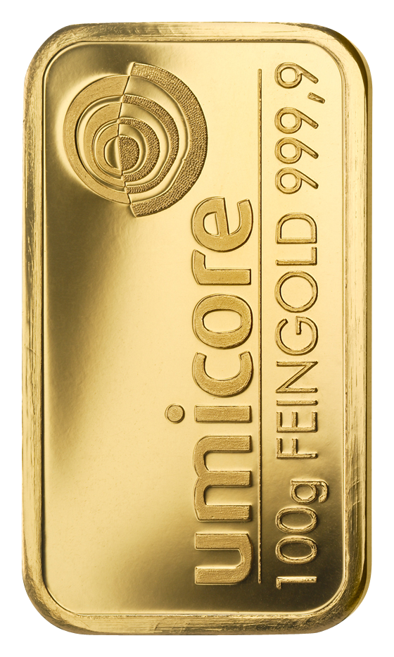 - 100 Gramm Goldbarren Umicore in Blisterkarte