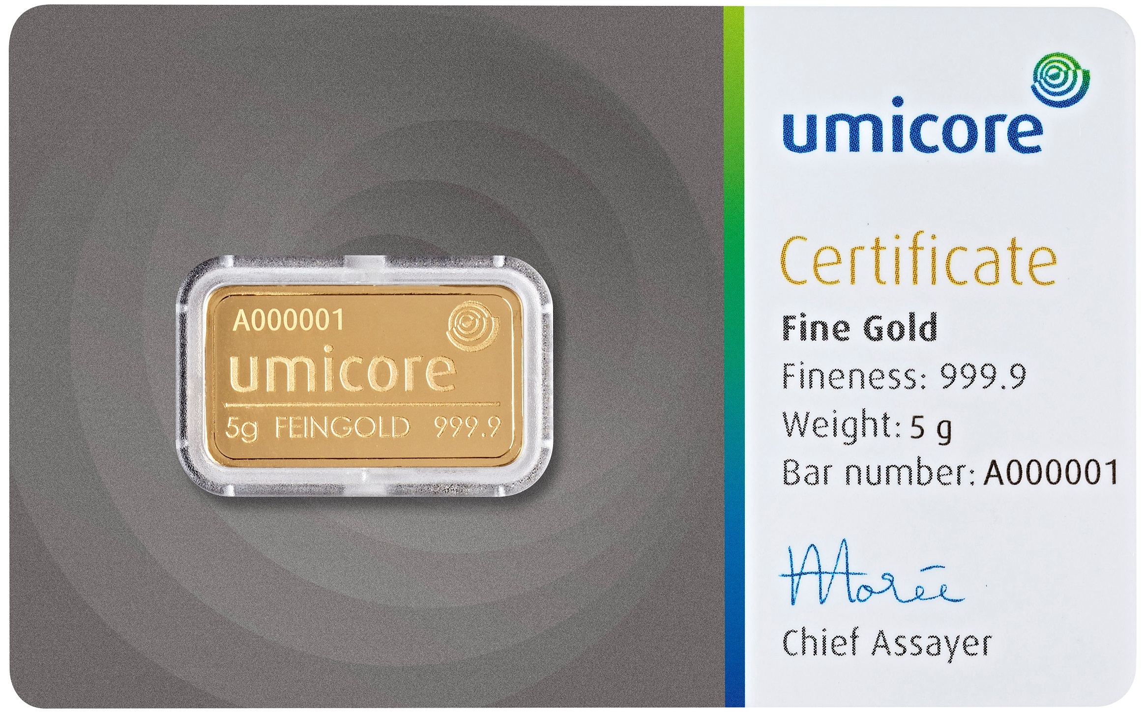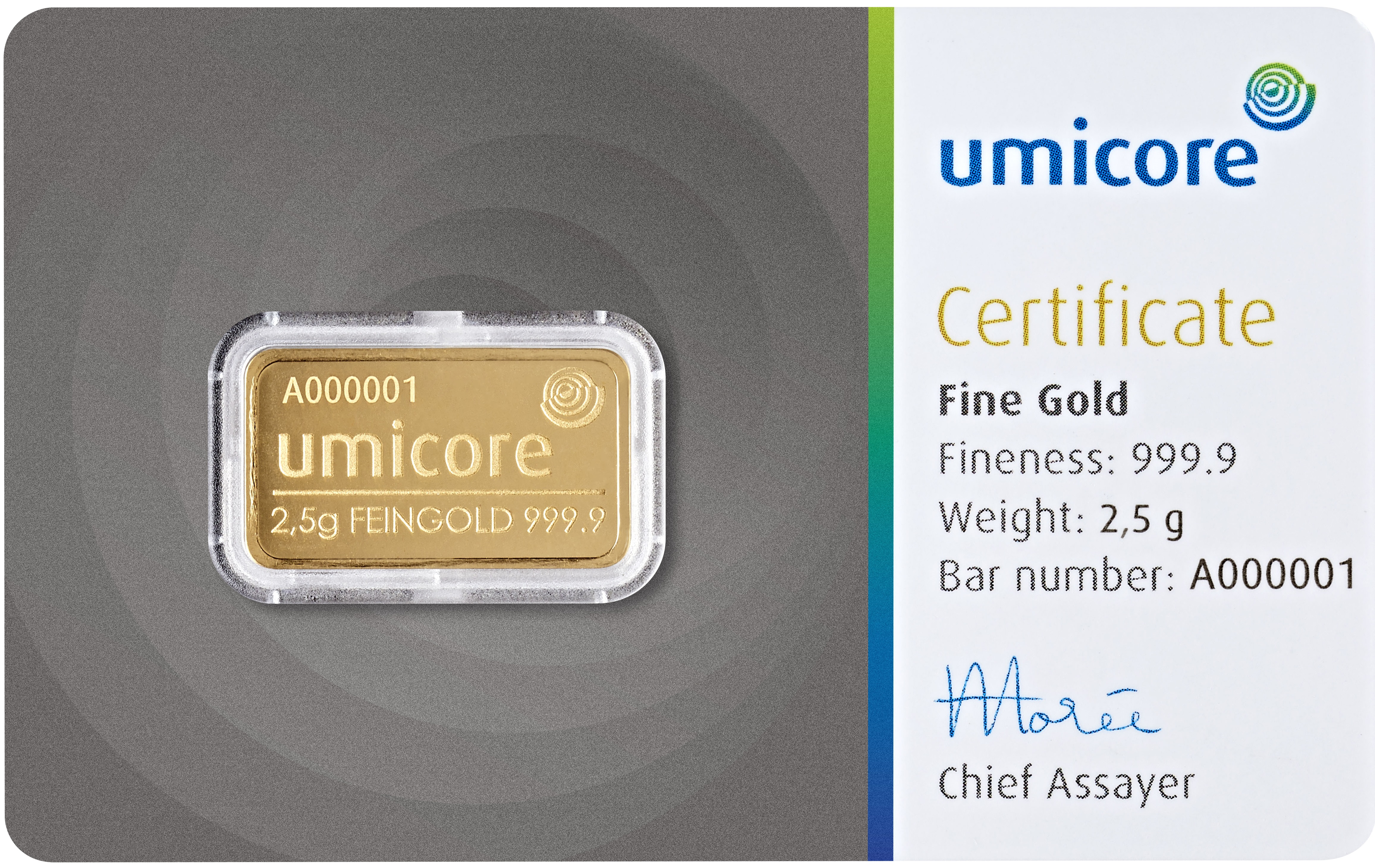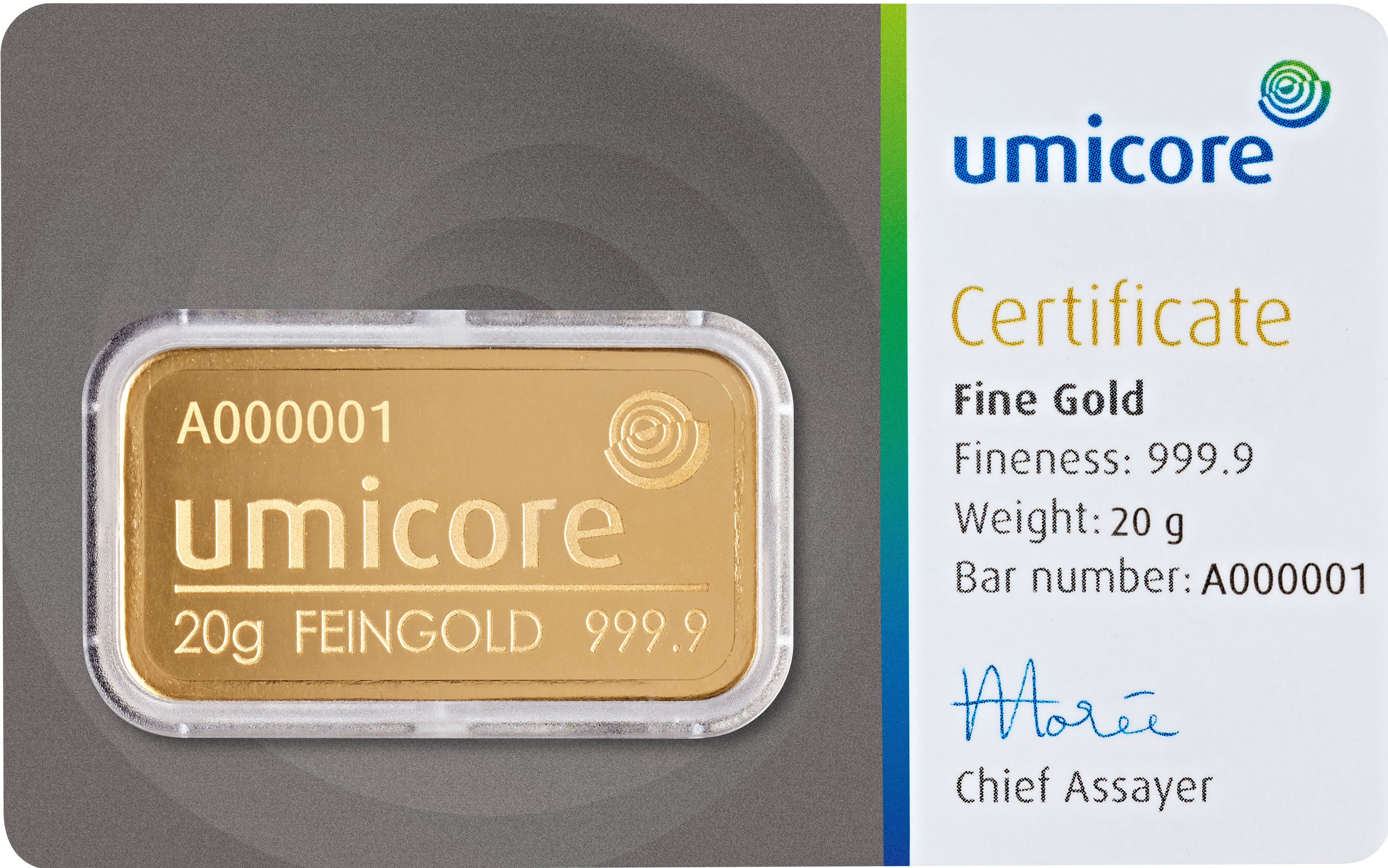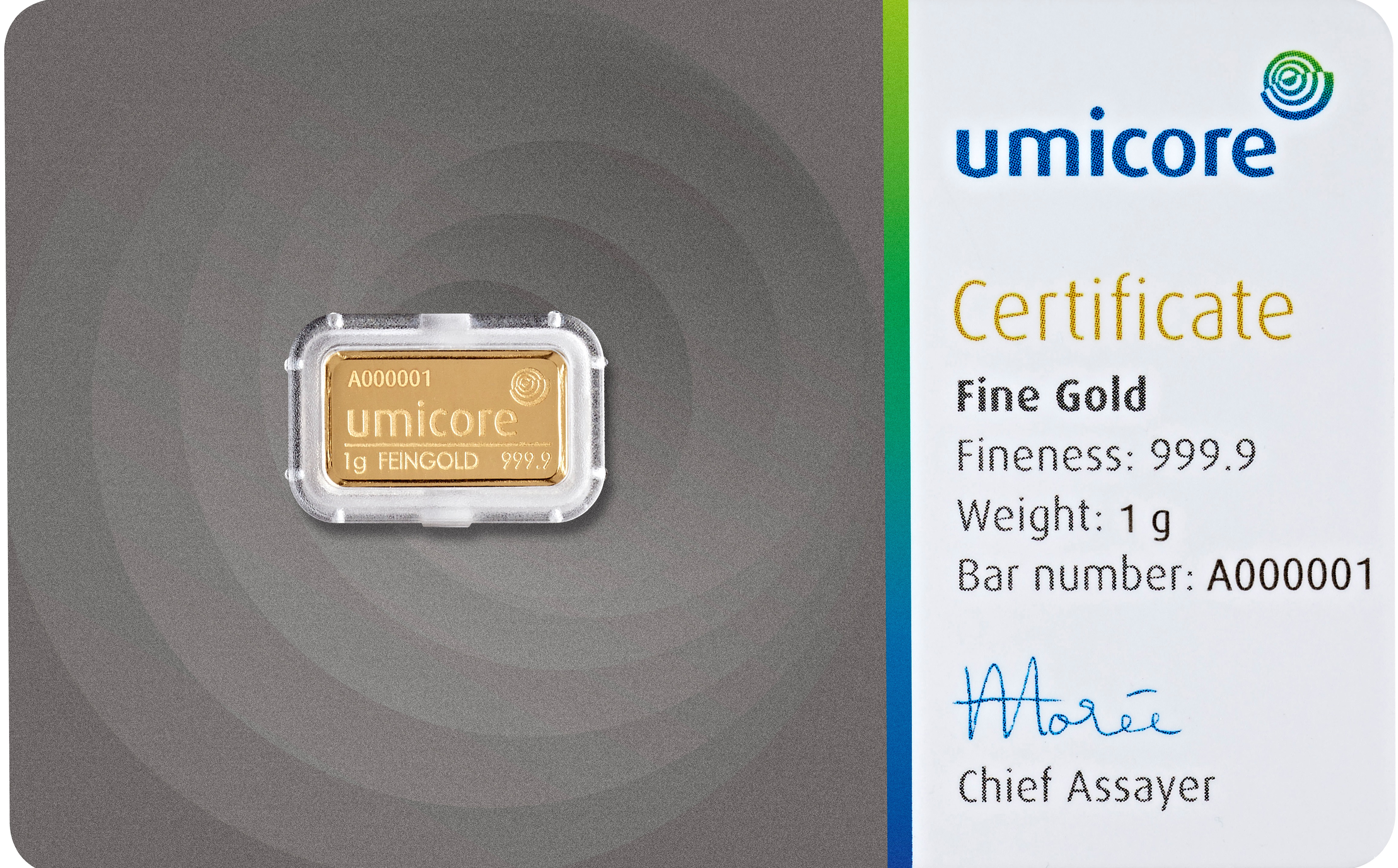 Umicore bietet insgesamt 13 verschiedene Goldbarren mit einem Feingewicht von 1 g bis 12.500 g an. Die Feinheit der Goldbarren beträgt 999.9/1000 oder 99,99%. Bei den Barren mit einem Feingewicht von 1 g bis 100 g handelt es sich um geprägte Goldbarren und ab einem Feingewicht von 250 Gramm um gegossene Goldbarren. Die Umicore Goldbarren werden in den Gewichten 1g, 2,5g, 5g, 10g, 20g, eine Unze, 50g und 100g im Querformat geprägt hergestellt und in einer Blisterkarte mit Zertifikat und Seriennummer ausgegeben. Die Gewichte 250g, 500g und 1kg gibt es als klassische Gussbarren und werden in Folie eingeschweißt mit Zertifikat und Seriennummer ausgegeben. Die Goldbarren, Silberbarren oder Münzbarren von Umicore entsprechen dem Good Delivery Standard der LBMA und stellen eine sichere Investition in Edelmetalle dar.