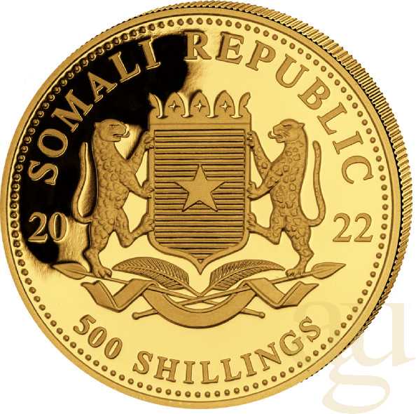 Namensgebend für die Münze ist der afrikanische Elefant, der auf der Vorderseite der Münze abgebildet ist. Das Motiv wechselt jedes Jahr, wodurch der Somalia Elefant zu einer beliebten Anlage- und Sammlermünze geworden ist. Auf der Rückseite sieht man das Staatswappen der Somalischen Republik, das Prägejahr, sowie den Nennwert der Münze. Die Anlagemünzen sind allgemein anerkannt, einfach zu kaufen, zu verkaufen, zu transportieren und zu lagern. Ältere Jahrgänge sind meist gegen einen erhöhten Aufschlag zu erwerben. Damit ist der Somalia Elefant die ideale Ergänzung für Ihre Kapitalanlage.
