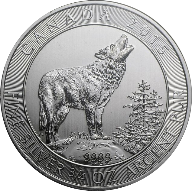 Die Silberanlagemünze mit Motiv "Kanadischer Grauwolf" Prägejahr 2015 wurde im Herbst 2014 von der Royal Canadian Mint vorgestellt. Das ungewöhnliche Gewicht in Höhe von einer 3/4 Unze fällt aus der Reihe der bisher bekannten Anlagemünzen. Das Motiv des Jahres 2015 wurde vom kanadischen Künstler Pierre Leduc entworfen und zeigt den Grauwolf stehend heulend auf einem Hügel umgeben von Nadelholz. Die Initialen "PL" sind links unterhalb des Schwanzes vom Wolf zu finden. Das Tiermotiv ist von einem Ring umgeben, welcher im oberen Bereich das Ausgabeland "Canada", das Prägejahr 2015 und im unteren Teil das Feingewicht von einer 3/4 Unze aufweist. Aufgrund der Zweisprachigkeit ist die Angabe Silber in Englisch und Französisch zu finden. Unterhalb des Grauwolfs ist die Feinheit von 9999 ergänzt. Die radialen Linien in Reliefform im Hintergrund dienen als Sicherheitsmerkmal. Die Münzrückseite zeigt die englische Königin Elizabeth II. In Rundschrift um das Kopfmotiv sind neben dem Namen der Queen (obenstehend - Elizabeth II) auch der Nennwert von zwei kanadischen Dollar abgebildet. Der Hintergrund ist von radialen Linien überzogen wie die Motivseite.