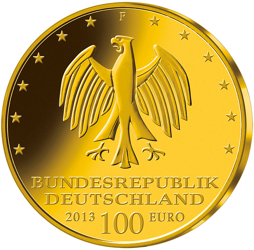 Mit der Würdigung des Dessau-Wörlitzer Gartenreiches wurde die Serie der 100 Euro Goldmünzen im Jahr 2013 fortgesetzt. Die europaweit bedeutende Kulturlandschaft in Sachsen-Anhalt gehört seit November 2000 zum UNESCO-Welterbe. Der nach dem Bruder des Fürsten Franz, Johann Georg Prinz von Anhalt-Dessau, benannte Park gilt als eine der Perlen im Gartenreich Dessau-Wörlitz. Für den Park Georgium wurde im ausgehenden 18. Jahrhundert eine ziemlich unwirtliche Auenbruchlandschaft nördlich von Dessau in einen Landschaftspark nach englischem Vorbild verwandelt. Für Architekten, Landschaftsplaner und Gärtner waren dies die großen Ruhm und Ansehen bringenden Herausforderungen ihrer Zeit. Die Philosophie des 18. Jahrhunderts spiegelt sich in dieser Kulturlandschaft mit englischen Parkanlagen, Schlössern, Weideflächen und von Tempeln im antiken Stil gesäumten Flüssen und Seen wieder. Das einzigartige Landschaftskunstwerk zwischen Dessau und Wittenberg ist auf etwa 142 km² in den Jahren 1765 bis 1800 von Fürst Leopold III. Friedrich Franz von Anhalt-Dessau und seinem Architekten Friedrich Wilhelm Freiherr von Erdmannsdorff gestaltet worden. Die Gestaltung der Goldmünze hat der Dipl. Designer Lorenz Crössmann aus Berlin umgesetzt. Auf der Bildseite hat der Grafiker die beiden Elemente des Gartenreichs, die Landschaft sowie die Architektur veranschaulicht. Zum einen ist die Rousseau-Insel als Entree der Wörlitzer Anlagen, in der sich die Philosophie des Fürsten Franz widerspiegelt, abgebildet. Zum anderen ist der Gründungsbau des Klassizismus, das vom Architekten Erdmannsdorff entworfene Wörlitzer Landhauses zu sehen. Zwischen den beiden Darstellungen befindet sich der Schriftzug „GARTENREICH DESSAU-WÖRLITZ“ sowie unterhalb der Parkanlage „UNESCO WELTERBE“. Die Rückseite ziert ein künstlerisch gestalteter Bundesadler, der von den zwölf Europa-Sternen, getrennt durch Prägestättenzeichen, in der oberen Münzhälfte eingesäumt ist. Zum ersten Mal befindet sich der Schriftzug "BUNDESREPUBLIK DEUTSCHLAND" nicht in der Rundschrift, sondern zu Füßen des Adlers. Neben dem Nominalwert von „100 EURO“ steht das Prägejahr "2013". Der Rand ist geriffelt.