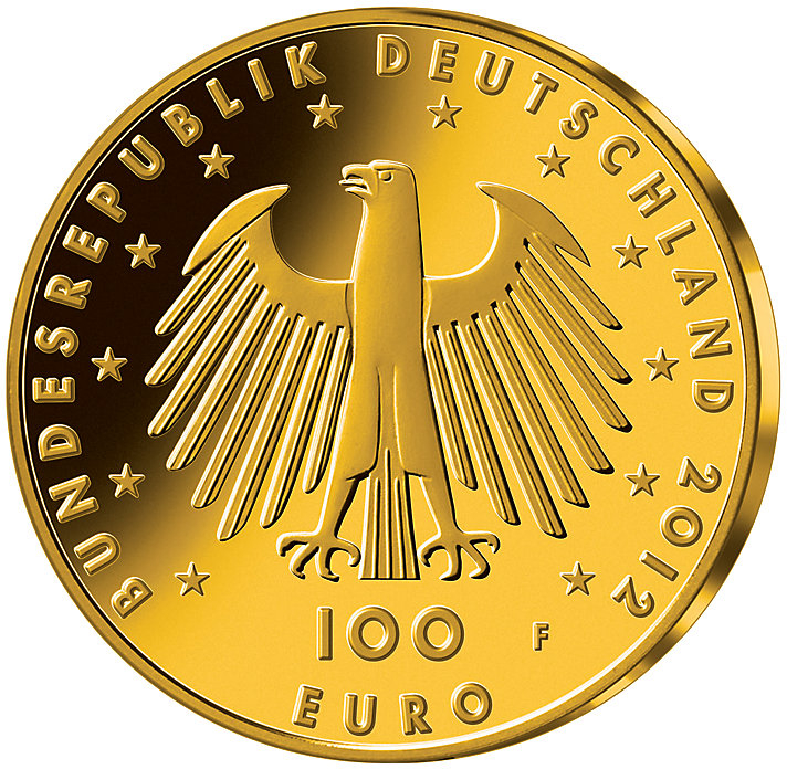 Die Deutsche 100 Euro Goldmünze 2012 Unesco Weltkulturerbe wurde dem Dom zu Aachen gewidmet. Mit Recht wurde der Dom zu Aachen 1978 als erstes deutsches Welterbe in die Liste der UNESCO aufgenommen. Der um 790 bis 800 erbaute Dom ist bau- und kunstgeschichtlich von universeller Bedeutung und eines der großen Vorbilder religiöser Architektur. Die Begräbnisstätte Karls des Großen war 600 Jahre lang Krönungsstätte deutscher Kaiser. Ein neues Rom sollte es werden, als Karl der Große um das Jahr 800 herum Aachen zum Mittelpunkt seines Reiches machte. Die Kapelle der Kaiserpfalz - der älteste Teil des heutigen Doms - sollte das religiöse Zentrum sein. In nur rund zehn Jahren Bauzeit, so vermutet man heute, entstand der monumentale Kuppelbau mit achteckigem Grundriss, ein architektonisches Meisterwerk, das sozusagen völkerverbindend oströmische und weströmische Formen in Einklang brachte. Als Karl der Große im Jahr 814 starb, wurde die Pfalzkapelle seine Begräbnisstätte. Die Bildseite zeigt den Dom zu Aachen in seiner ganzen Breite und Höhe bis an den Rand der Münze. Die Darstellung stammt von dem  Münchner Medailleur Erich Ott. Die Münze besticht durch ihre feine und plastisch detaillierte Ausführung. Die Umschrift lautet „WELTERBE DOM ZU AACHEN UNESCO“. Die Wertseite zeigt den Bundesadler, die Umschrift „BUNDESREPUBLIK DEUTSCHLAND 2012“, darunter im Halbkreis angeordnet die 12 Europasterne und den Nennwert von „100 EURO“,  sowie je nach Prägestätte das jeweilige Münzzeichen. Der Münzrand ist wie immer geriffelt.