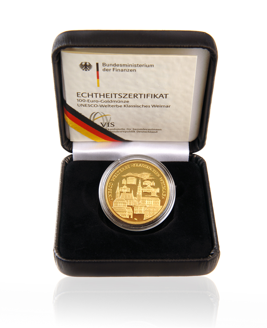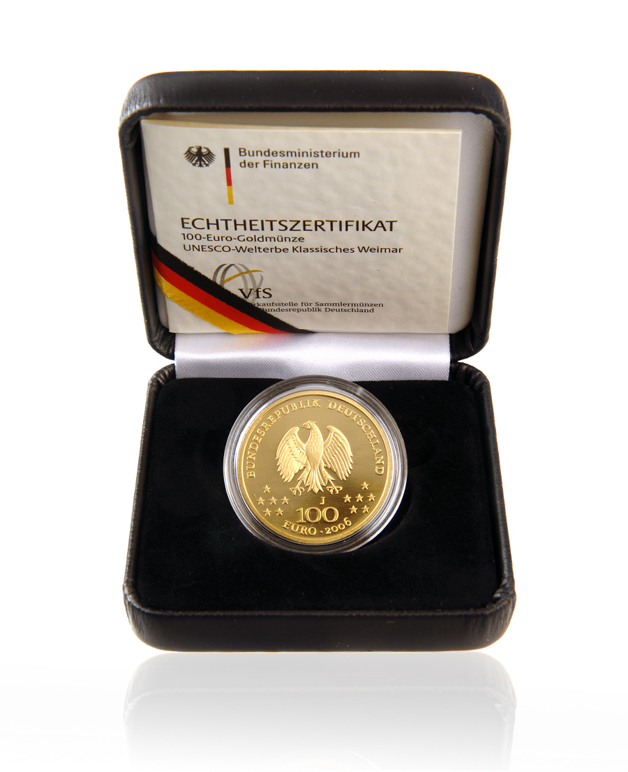 Das Welterbekomitee der UNESCO nahm 1998 das „Klassisches Weimar“ in die Liste des Erbes der Welt auf. Zum Welterbe gehören Gebäude der Weimarer Altstadt wie auch die weitläufigen Parkanlagen und deren Einzelbauten, die in exemplarischer Weise die Kulturepoche der Weimarer Klassik repräsentieren. Der bekannte Briefmarken- und Münzdesigner Dietrich Dorfstecher entwarf das Motiv der 100 Euro Goldmünze "UNESCO-Weltkulturerbe Stadt Weimar". Die Bildseite zeigt alle elf Welterbe-Denkmäler und Architekturelemente der Stadt. Goethes Wohnhaus, Schillers Wohnhaus, Wittumspalais, Herzogin Anna Amalia Bibliothek, Stadtschloss, Stadtkirche mit Herderhaus und Altem Gymnasium, Fürstengruft mit historischem Friedhof, Park an der Ilm mit Römischem Haus, Goethes Gartenhaus und Garten, Schlosspark Belvedere mit Schloss und Orangerie, Schloss und Schlosspark Tiefurt sowie Schloss und Schlosspark Ettersburg. Die Umschrift lautet „UNESCO WELTERBE KLASSISCHES WEIMAR“. Auf der Rückseite ist der Bundesadler abgebildet. Umgeben ist er von der Rundschrift "BUNDESREPUBLIK DEUTSCHLAND ". Der Nennwert in Höhe von „100 EURO“ und dem Prägejahr "2006“, sowie den jeweilige Buchstabe der Prägestätte ( A, D, F, G, J), sind unter dem Wappenvogel zu finden. Rechts und links der Angaben befinden sich zu gleichen Teilen die 12 Europasterne.