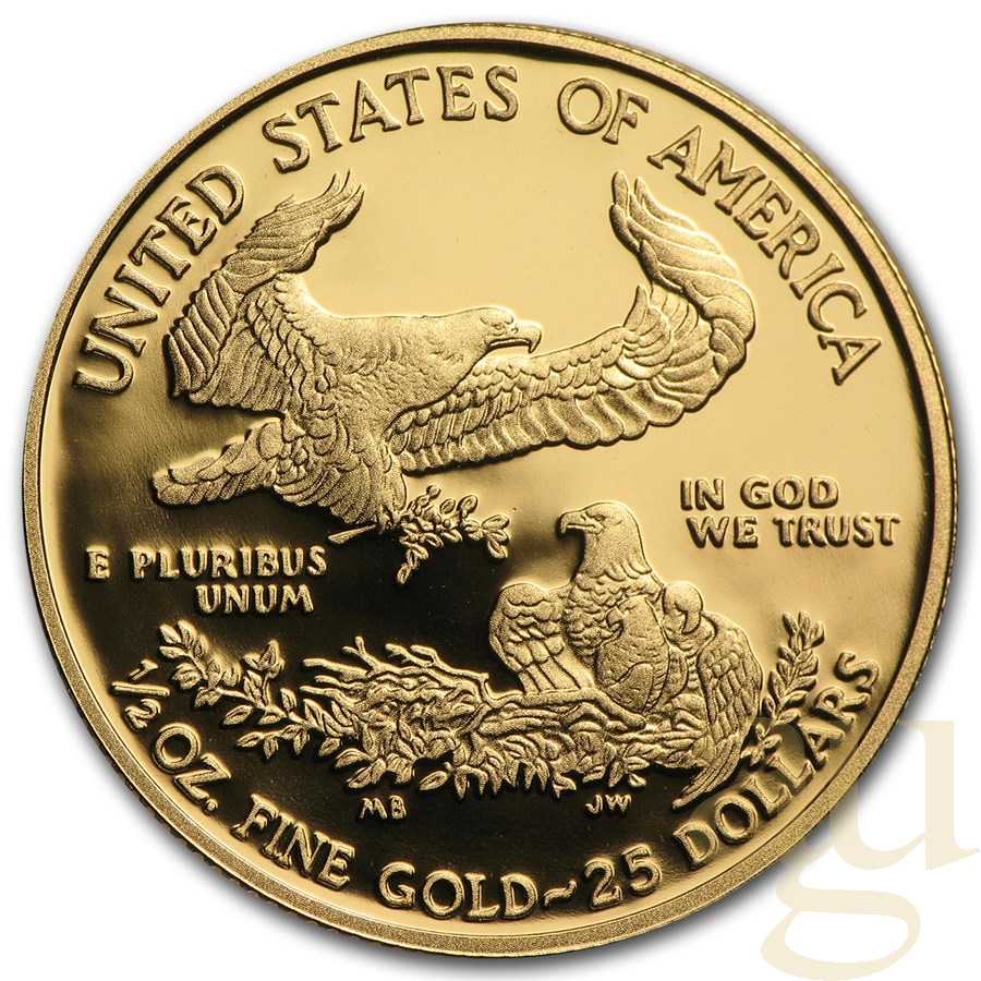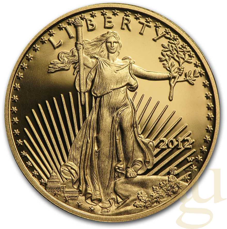 Die Gold American Eagle Münze zählt zu den bekanntersten Anlagemünzen und wurde von der U.S. Mint erstmals im Jahr 1986 ausgegeben. Die US-Mint ist die offizielle Prägeanstalt der Vereinigten Staaten von Amerika. Deshalb ist die American Eagle Goldmünze eine der offiziellen Bullion Coins der USA. Die Regierung der USA garantiert das ordnungsgemäße Gewicht, die Feinheit und den Goldgehalt der Münze. Die American Eagle der U.S. Mint weisen eine Feinheit von 916,67/1.000 Gold auf. Der Münzrand ist geriffelt. Die Kopfseite zeigt nach einem Entwurf von Augustus Saint-Gaudens die Freiheitsgöttin „Lady Liberty“ mit einer Fackel in ihrer rechten Hand. In der linken hält sie einen Olivenzweig. Dieses Design entspricht dem Double Eagle von 1907-1933 und ist seit dem Erstprägungsjahr 1986 unverändert. Die Strahlen im Hintergrund sollen den Sonnenaufgang darstellen. Links ist das Kapitol, das amerikanische Parlament, zu sehen. Der Schriftzug „Liberty“ ist oberhalb eingeprägt. Die Jahreszahlen der Gold Eagles der Prägejahre bis 1991 sind mit Römischen Zahlen angegeben. Ab 1992 wurde die Jahreszahl in arabischen Zahlen aufgeprägt. Auf der Rückseite ist nach einem Entwurf von Miley Busiek ein männlicher Weißkopfadler abgebildet, der ebenfalls einen Olivenzweig als Freiheitssymbol in der Kralle trägt. Er fliegt über ein Nest, in dem sich der weibliche Adler mit den Küken befinden. Des Weiteren ist der Schriftzug „United States Of America“ und „In God We Trust“ sowie „E Pluribus Unum“ (aus Vielen Eins) zu lesen. Darunter ist der Nennwert sowie die Feineinheit des Eagle angegeben. Bis auf die angegebenen Nennwerte und Feingewichte ist das Design der unterschiedlichen Gold Eagles identisch. Wie bei allen Anlagemünzen hat der Nennwert eher symbolischen Charakter, der tatsächliche Handelswert liegt weit über dem angegebenen. Das Aufgeld auf den reinen Goldwert ist allerdings nicht sehr hoch, da sich der Verkaufspreis knapp über dem tatsächlichen Börsengoldwert orientiert. Dennoch sind die Gold Eagles ein offizielles Zahlungsmittel in den USA. Die beliebten Kapitalanlagemünzen werden in verschiedenen Größen ab 1/10 Unze bis zu einer ganzen Unze (31,1 Gramm) geprägt. Die Münzen werden von der Prägeanstalt in Tuben ausgegeben. Sie erhalten die Münzen von uns einzeln in Münztaschen oder wenn Sie mehrere bestellen in einer Tube.
