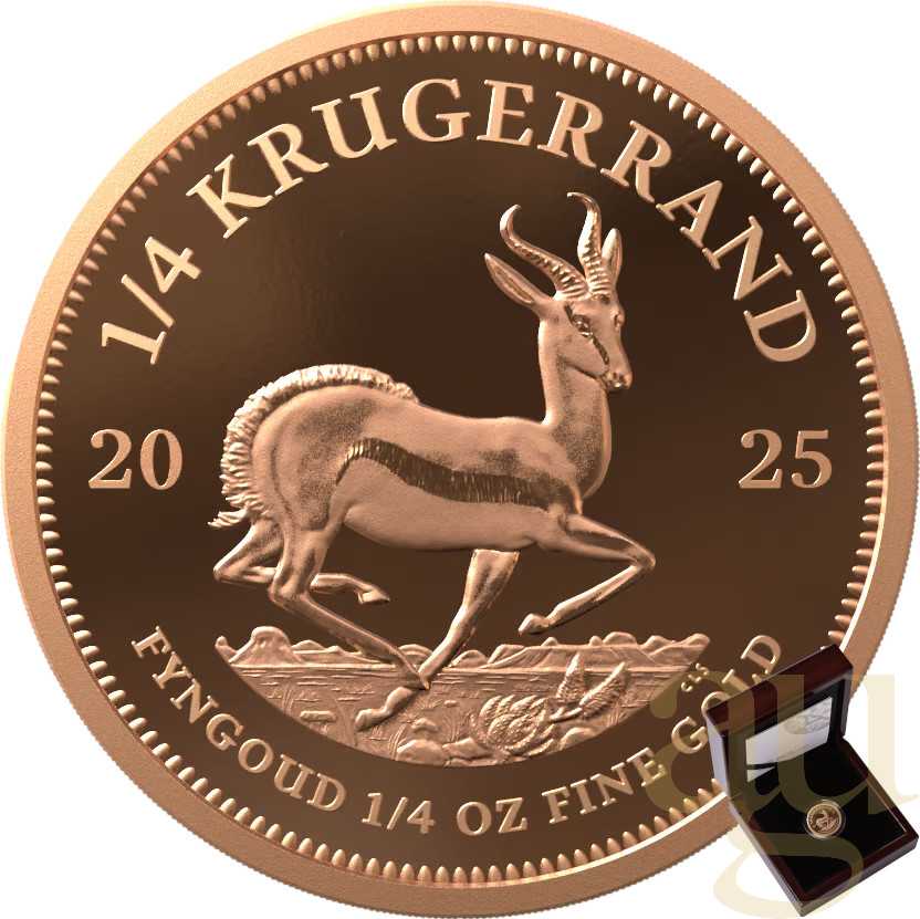 Die Krügerrand Goldmünze ist die bekannteste und zugleich beliebteste Kapitalanlagemünze weltweit. Seit der ersten Prägung 1967 wurden über 46 Million Stück hergestellt und verkauft. Aufgrund des Kupferanteils von ca. 9% erhält die Münze einen rötlich-goldenen Farbton. Die Feinheit beträgt 916,6/1.000. Das Kupfer wird zusätzlich zum reinen Goldwert von einer 1/4 Unze (7,78g) beigemischt, um die Münze härter zu machen und sie so vor Beschädigungen wie Kratzer, Dellen und Abschürfungen zu schützen. Der reine Goldwert beträgt aber immer genau eine 1/4 Unze Feingold. Das Gesamtgewicht beträgt 8,48 Gramm. Laut Herstellerangabe handelt es sich bei den Abmessungen um maximale Werte. Die Vorderseite zeigt ein Porträt von „Paul Kruger“. Paul Krüger (dt. geschrieben) war von 1882-1902 Präsident der Südafrikanischen Republik. Auf der Rückseite ist das südafrikanische Nationaltier „Springbock Antilope“ abgebildet. Das Motiv ist seit dem ersten Jahrgang gleich geblieben, um einen Wiedererkennungswert zu erzeugen. Formal ist die Goldmünze nach der südafrikanischen Notenbankverordnung ein offizielles Zahlungsmittel in ganz Südafrika. Im Gegensatz zu den meisten Münzen trägt der Krügerrand keinen aufgeprägten Nennwert, dieser wird stattdessen an jedem Werktag von offizieller Seite in Bezug zum Marktpreis des Goldgehaltes neu festgesetzt.