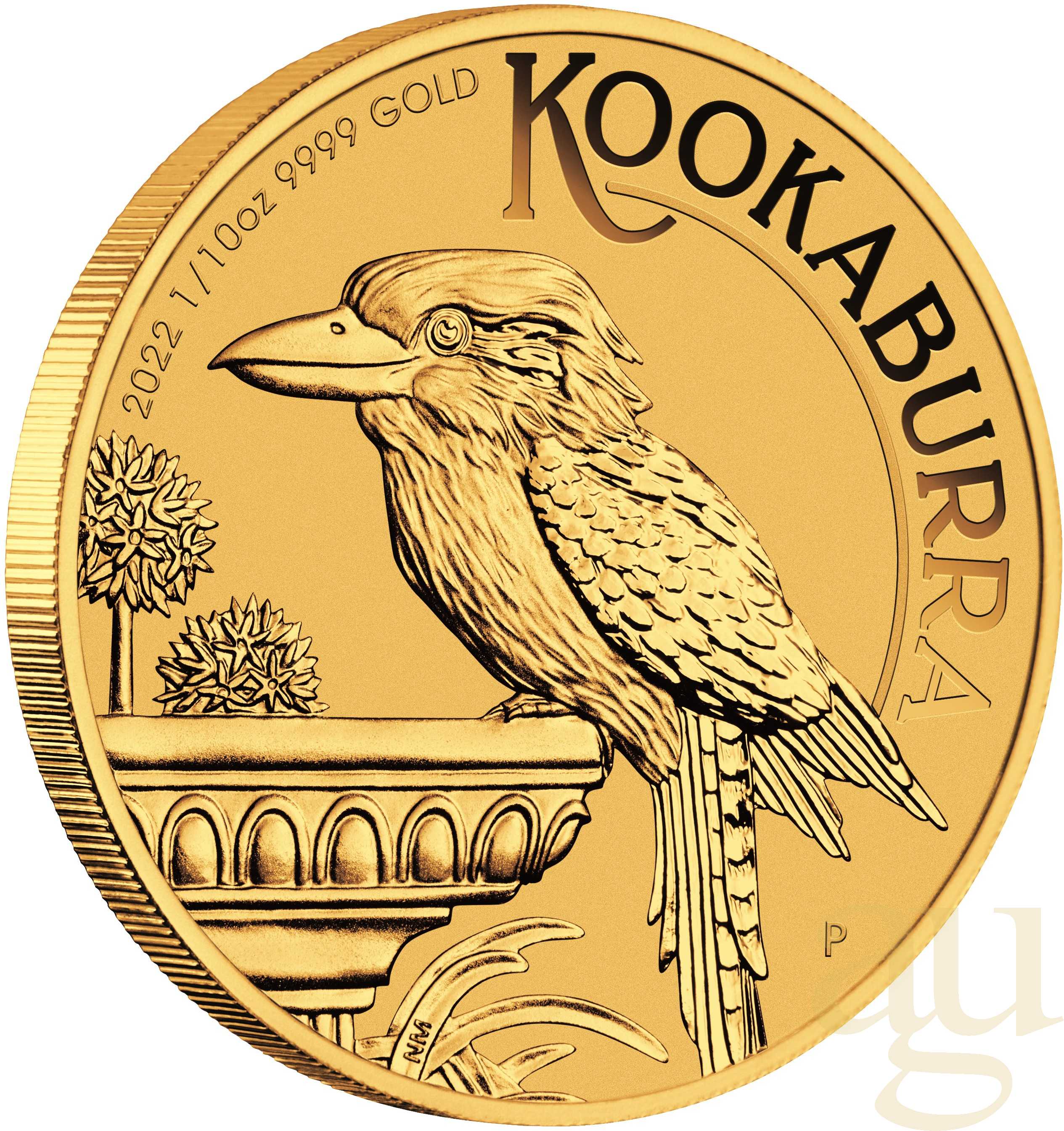 Den Eisvogel Kookaburra gibt es außer in Silber inzwischen auch als Kookaburra Goldmünze in den Einheiten 1/10 oz und 2 oz zu kaufen. Der Nennwert der Goldmünze beträgt 15 AUD. Die Bildseite zeigt immer den Kookaburra in jährlich wechselnden Motiven. Das Revers ziert das Porträt der englischen Königin Elizabeth II mit Nennwertangabe, das Bildnis ist gleichbleibend und wurde 1999 der Queen angepasst.